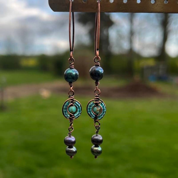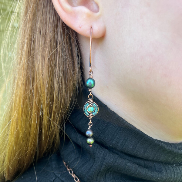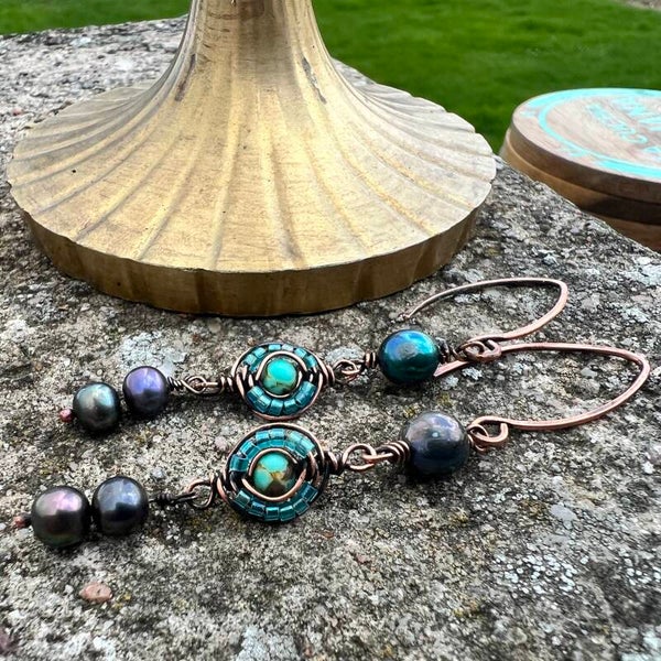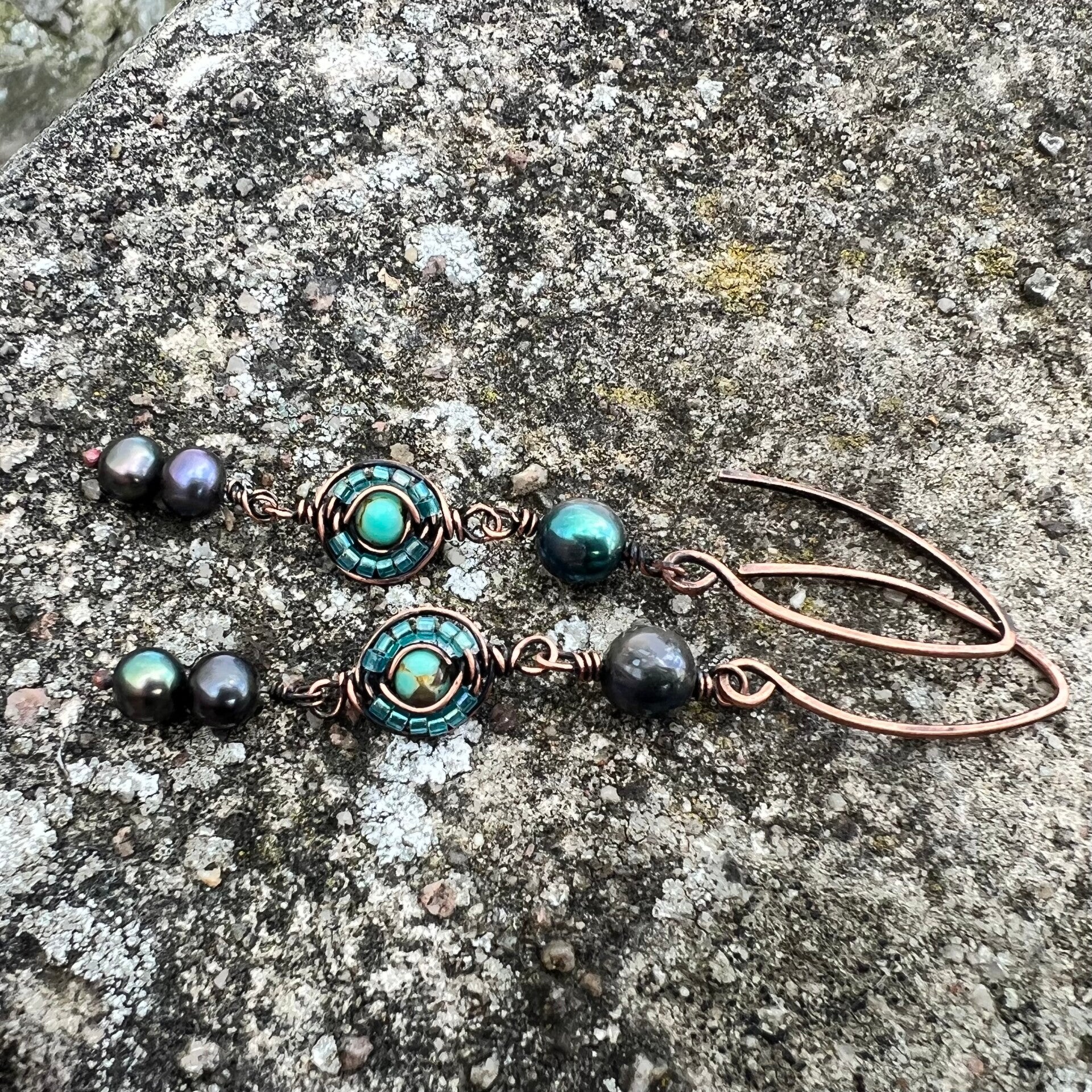 Disse fantastiske øreringe med de smukkeste ferskvandsperler i en flot blågrøn farve, giver disse øreringe et meget eksklusivt udtryk. Sammen med den turkies farvet skalperle og de små Miyuki perler, følendes disse med det oxideret kobber.