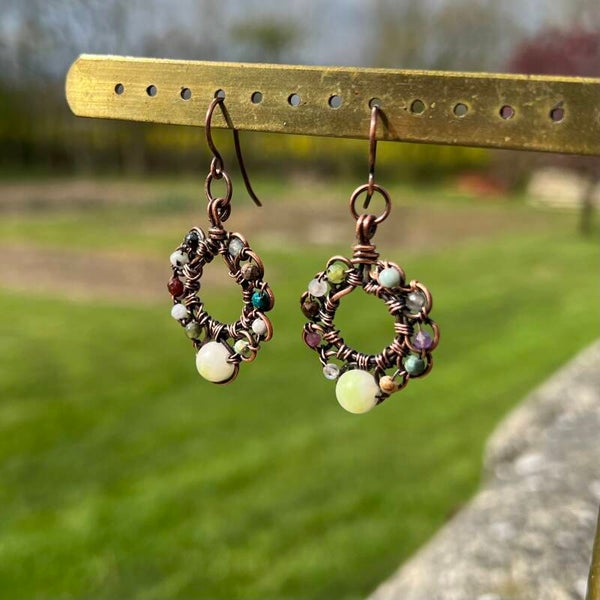 Dette par øreringe, er sammensat af en masse forskellige sten og krystaller. Så de får et unikt look med de mange flotte små facetslebet sten. Om hver perle findes en lidt grover kobbertråd, som flot indrammer dem.