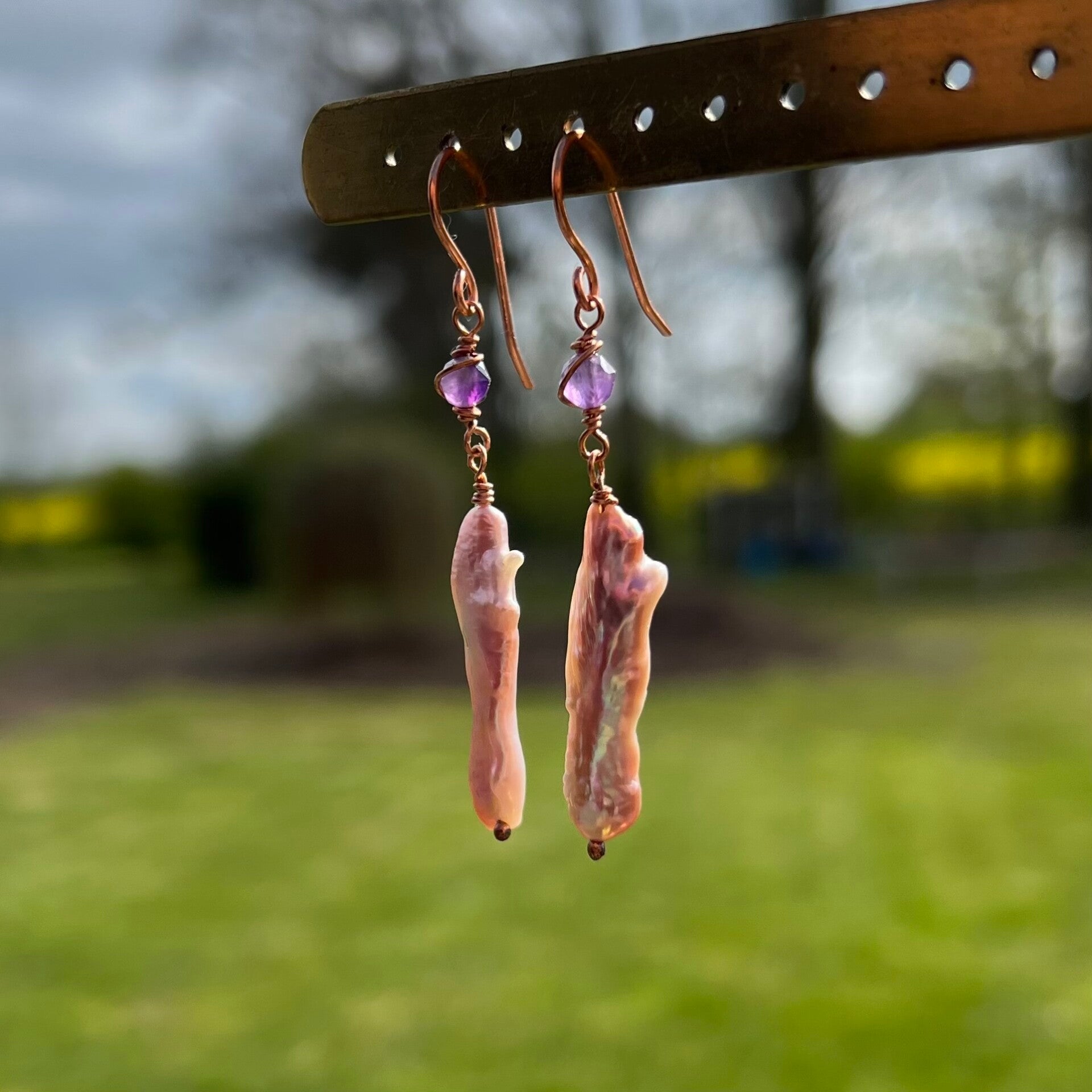 Materiale: Lakeret Kobber, Ametyst, Keshi Ferskvandsperle.