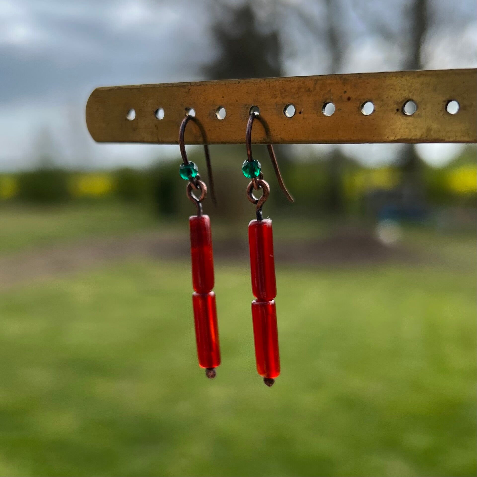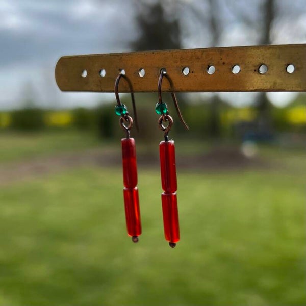 Dette smukke par øreringe, med de flotte røde karneol perler og i toppen en lille facetslebet grøn krystal. Det et par øreringe som kan give liv til hverdagen.