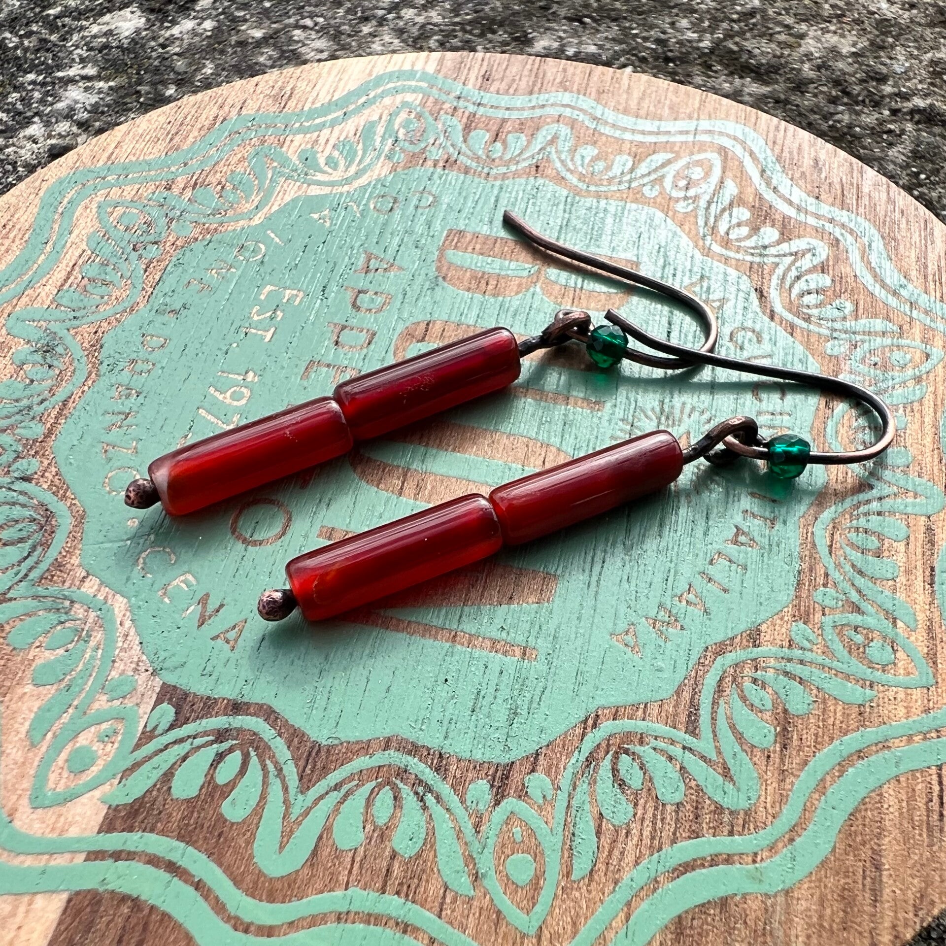 Materiale: Karneol, krystal og kobber der er oxideret og lakeret.