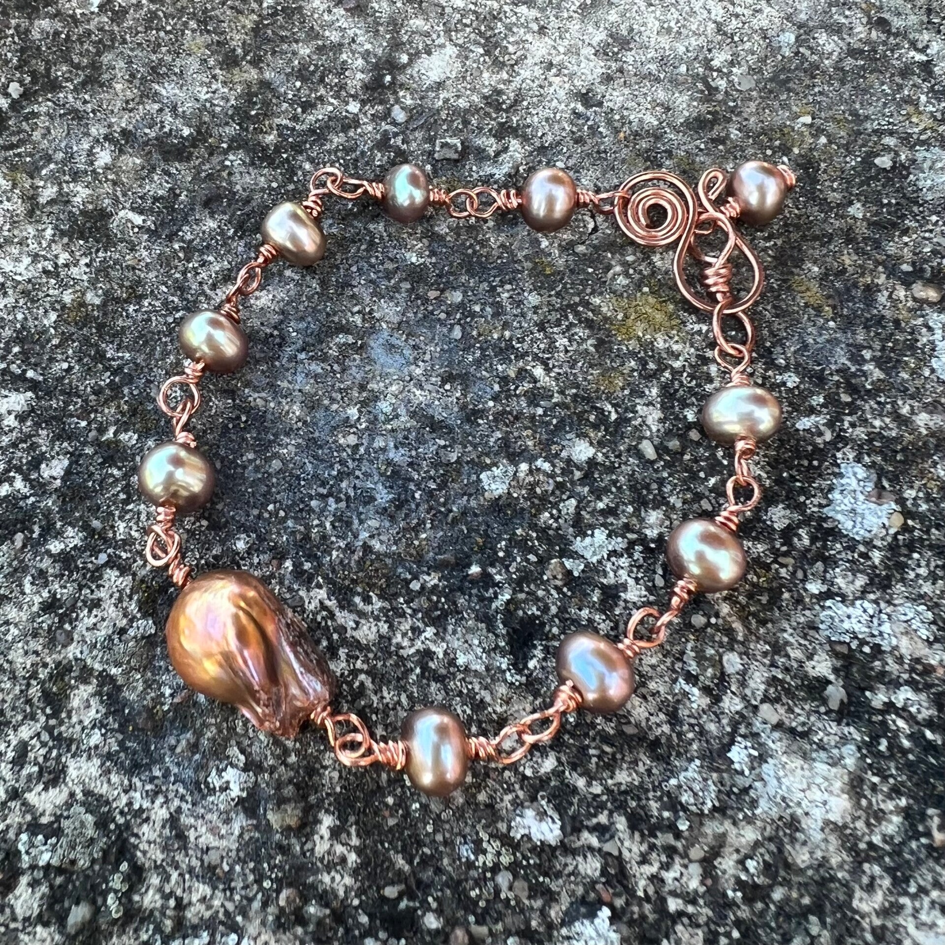 Dette smukke armbånd, er fyldt med de smukkeste ferskvandsperler. En smuk Keshi perle i kobber nuance, sammen med de mørk champangefarvet perler, står det super smukt. Armbåndet er fremstillet med kobber, disse perler står smukt med kobberet.