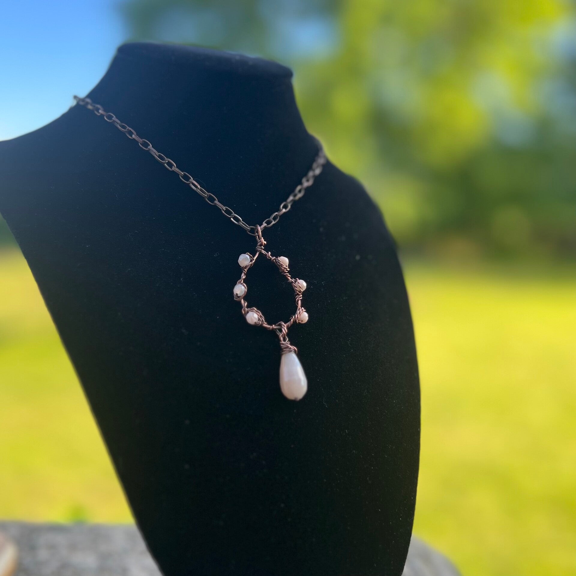 Denne smukke halskæde, med de smukke Sunstone perler, både vævet ind i selve vedhænget og den smukke facetslebet dråbe, i forlængelse heraf.