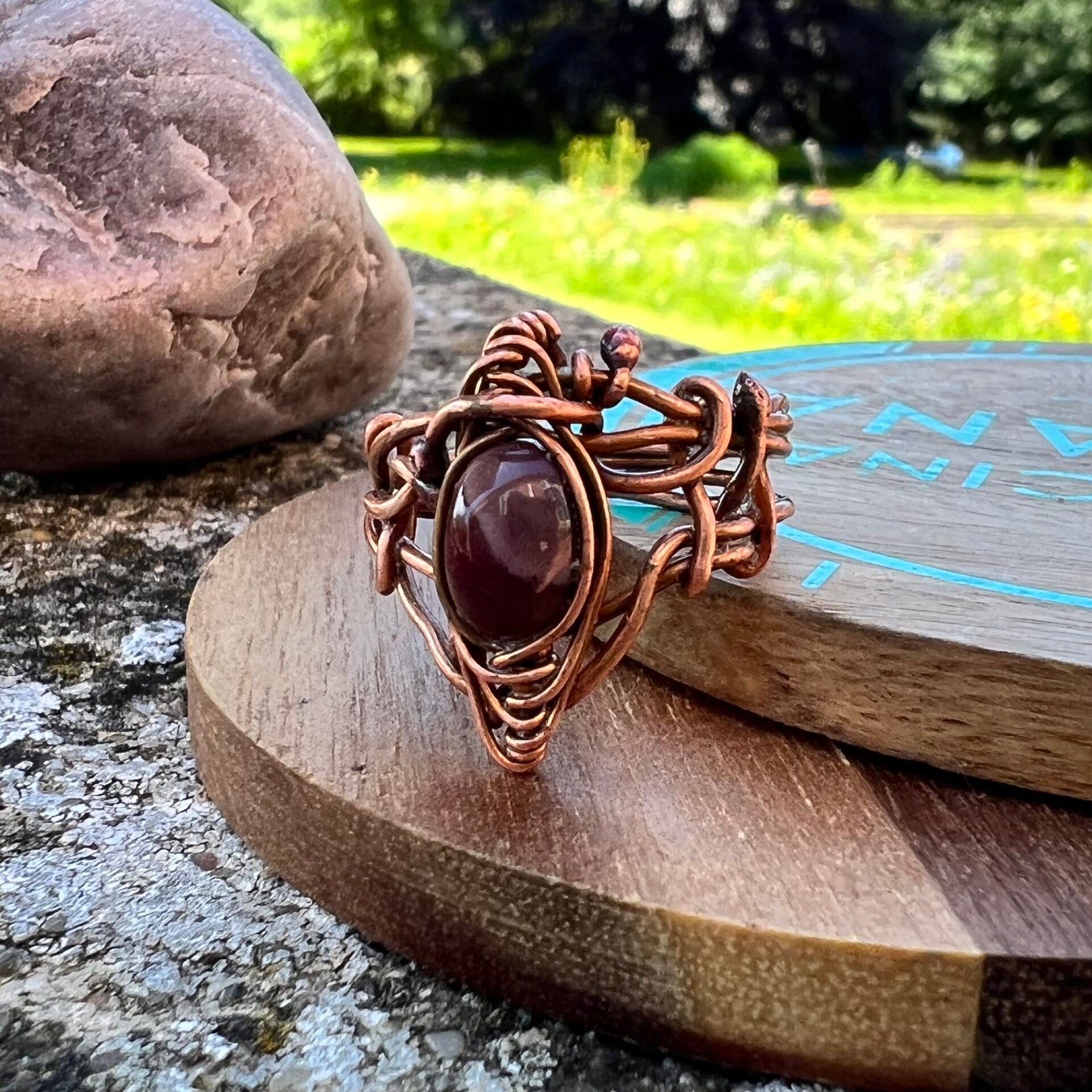 Oplev skønheden i denne unikke, håndviklede ring, hvor fine detaljer er i fokus. Ringen er omhyggeligt fremstillet med en smuk bordeauxfarvet Mookaite-sten som centrum. Stenen er særligt bemærkelsesværdig, da den på den ene side har en let lysende nuance, som skaber en betagende og naturlig effekt. Denne ring er ikke blot et smykke, men et kunstværk, der kombinerer elegance og organisk design på smukkeste vis.