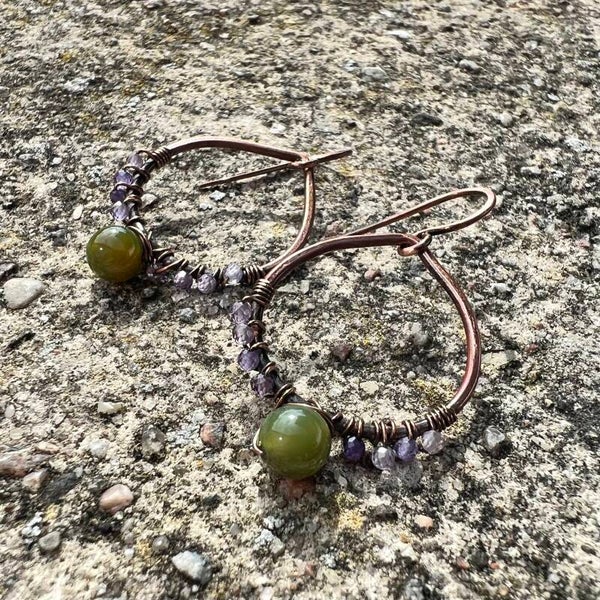 Disse skønne øreringe er håndlavede og unikt designet med en kombination af vintage kobbertråd og smukke ædelsten. Med de fineste små facetslebne ametystperler og en iøjnefaldende grøn agatperle i centrum, skaber de et elegant og tidløst look. Øreringene er perfekte til alle outfits, hvad enten det er til hverdag eller festlige lejligheder. Dette er mere end bare smykker – det er et kunstværk, der tilføjer stil og personlighed til dit udtryk.
