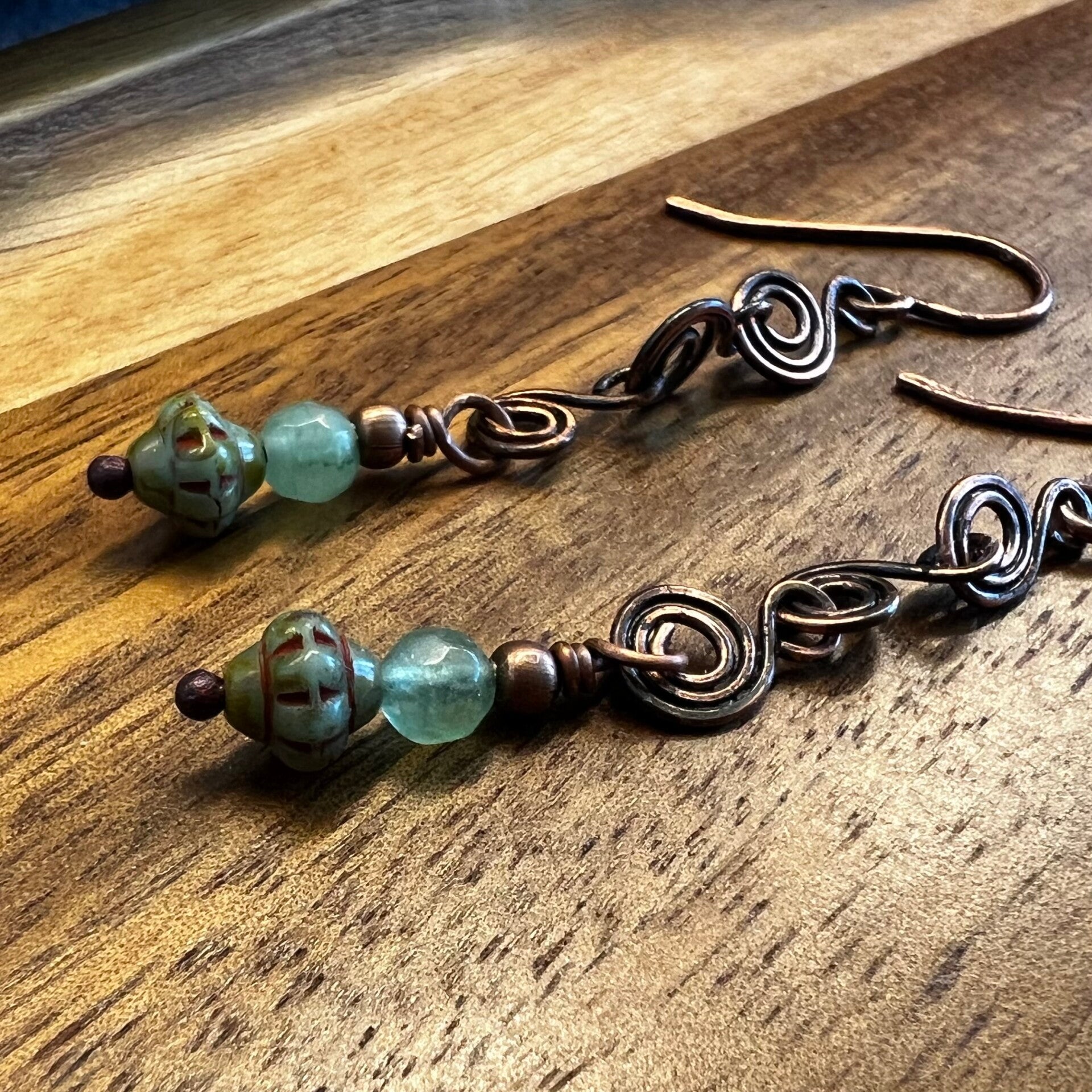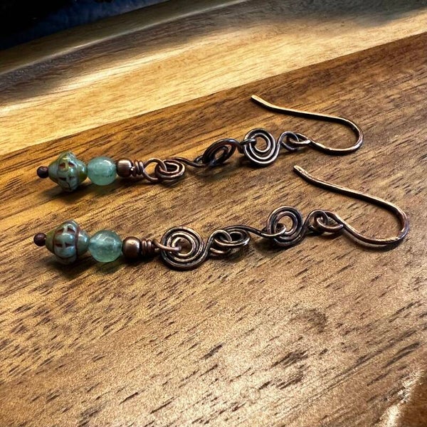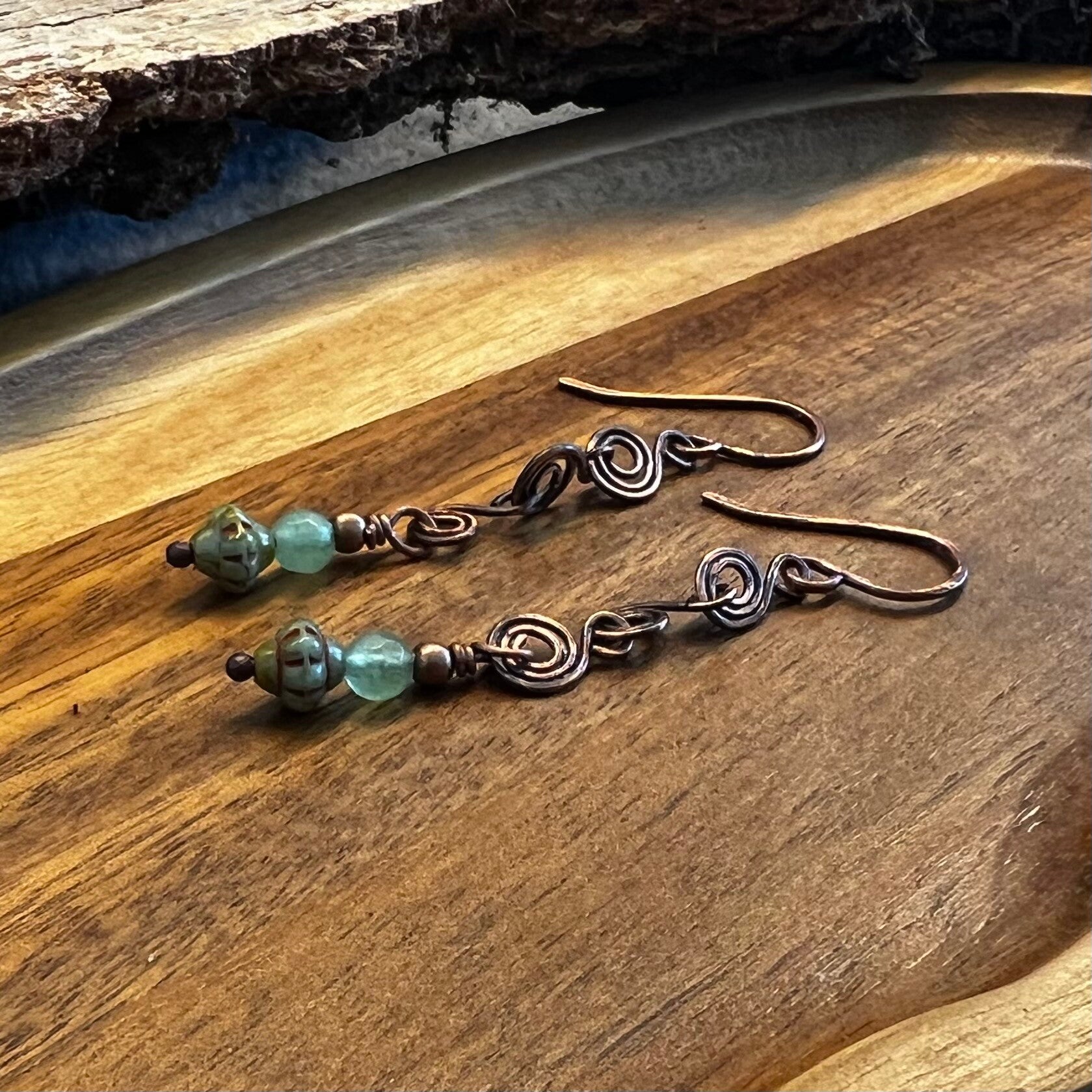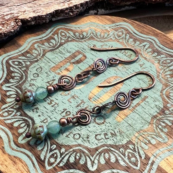 Disse øreringe er skabt til dig, der elsker det detaljerede håndværk, hvor hver eneste spiral er formet i hånden. Det oxiderede kobber giver smykket dybde og en antik karakter, der står smukt i kontrast til de friske grønne og blålige nuancer fra natursten og glas.