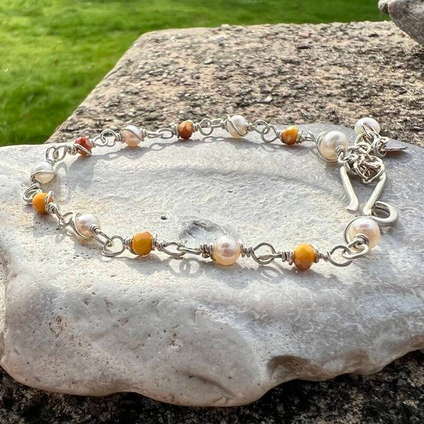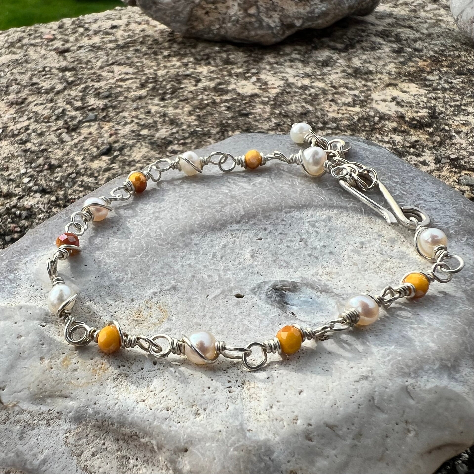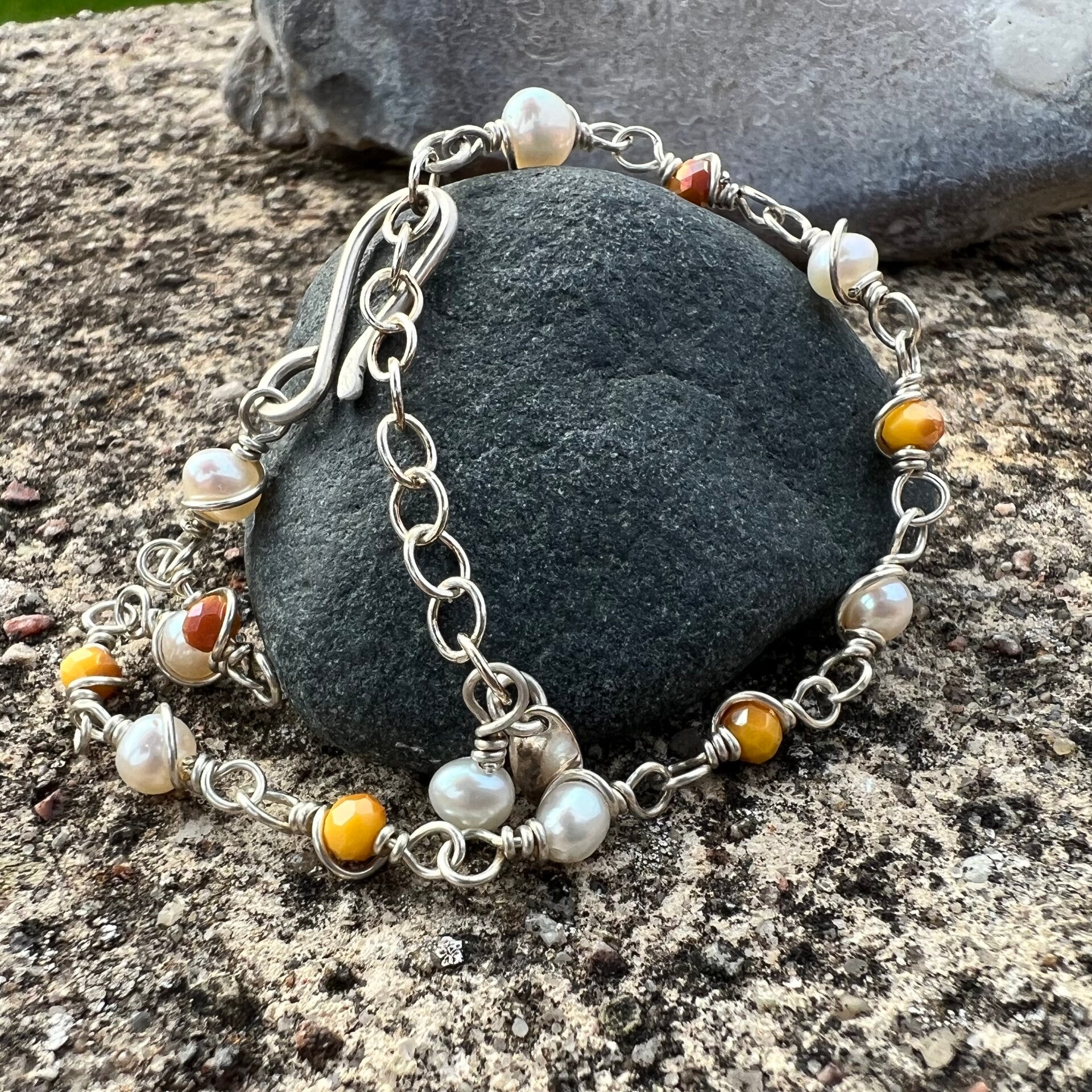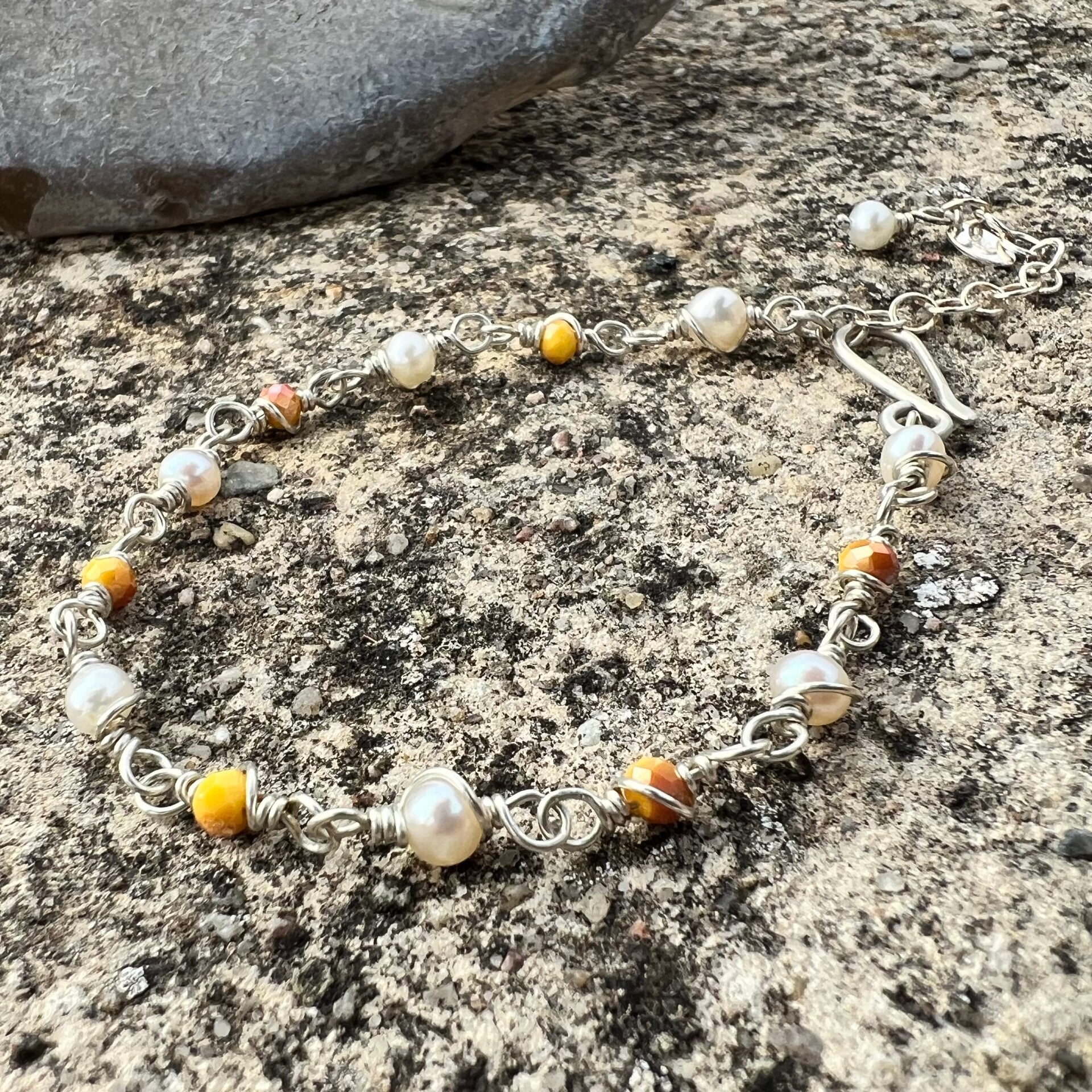 Dette smukke armbånd, er i et klassisk design, her viklet med smukke ferskvandsperle og gul/orange facetslebet perler.