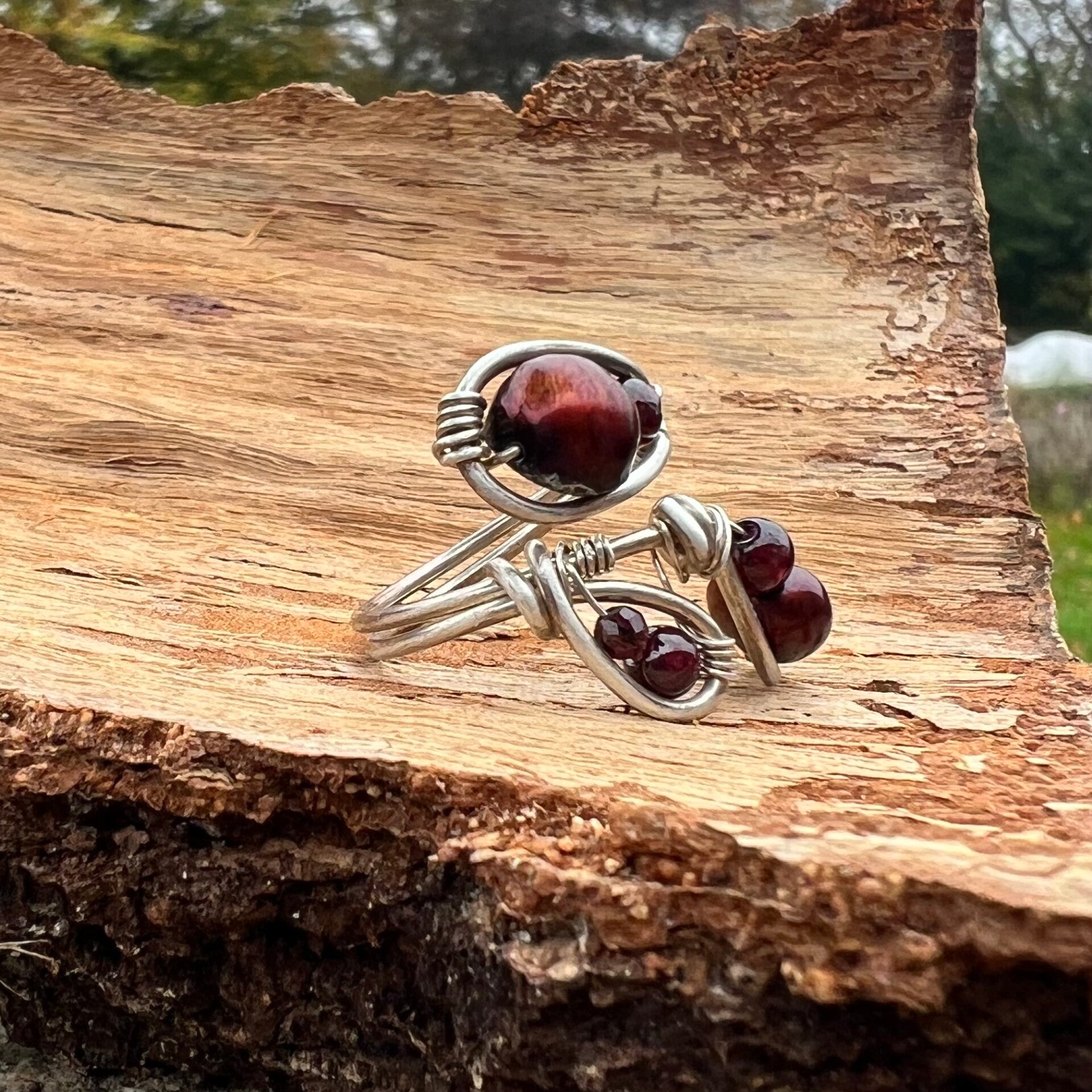 Denne Curvy ring, er fremstillet med smukke perler i Bordeaux farve, det står smukt med sølvet. Denne type ring, fylder en del på fingeren. Lækker stil.