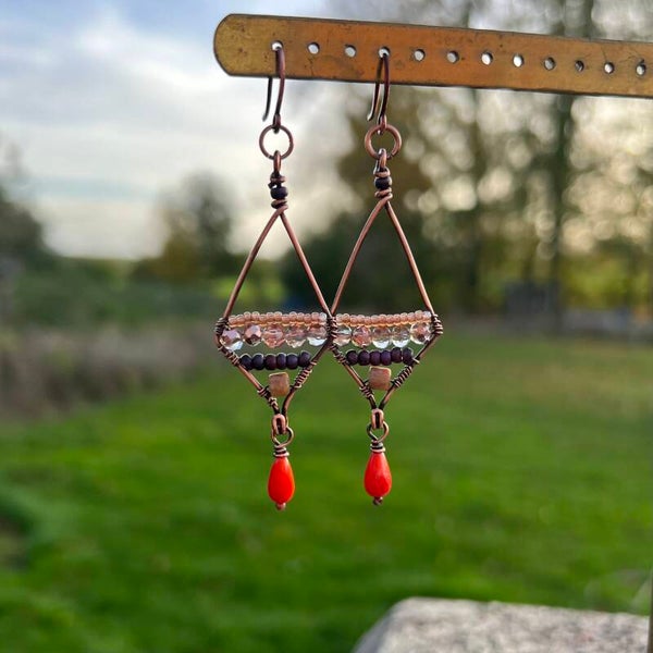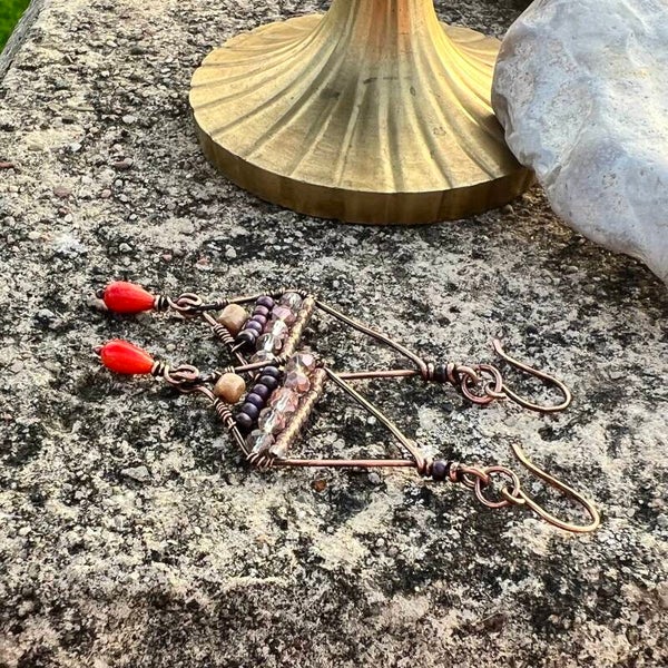 Dette skønne par, er fremstillet med forskellige perler og i forskellige farver og form. Nederst en smuk rød koral dråbe.