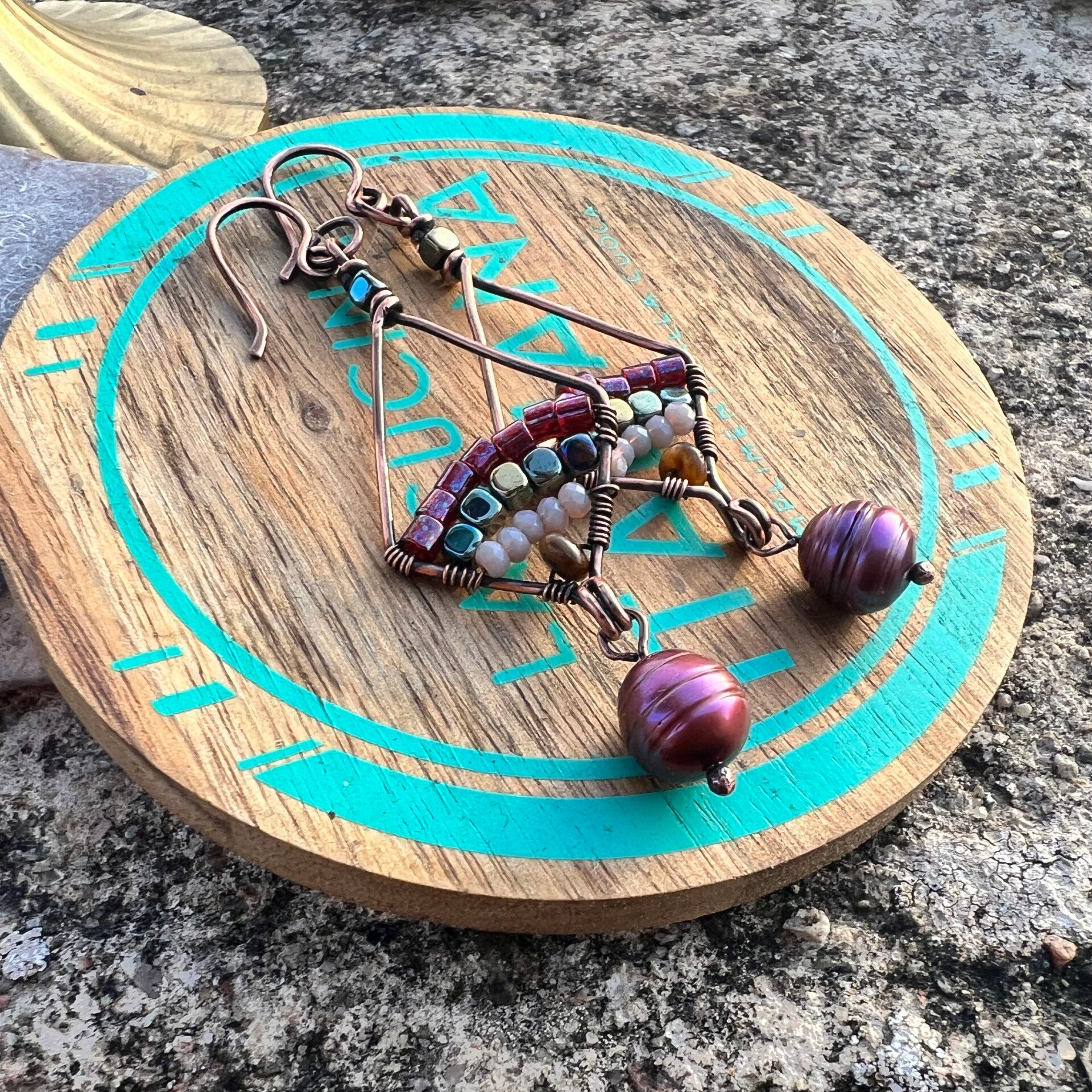 Dette skønne par, har de mest unikke violette ferskvandsperler, farven står super flot sammen med det oxideret kobber. Øreringene har en helt vidunderlig Bohemian stil.