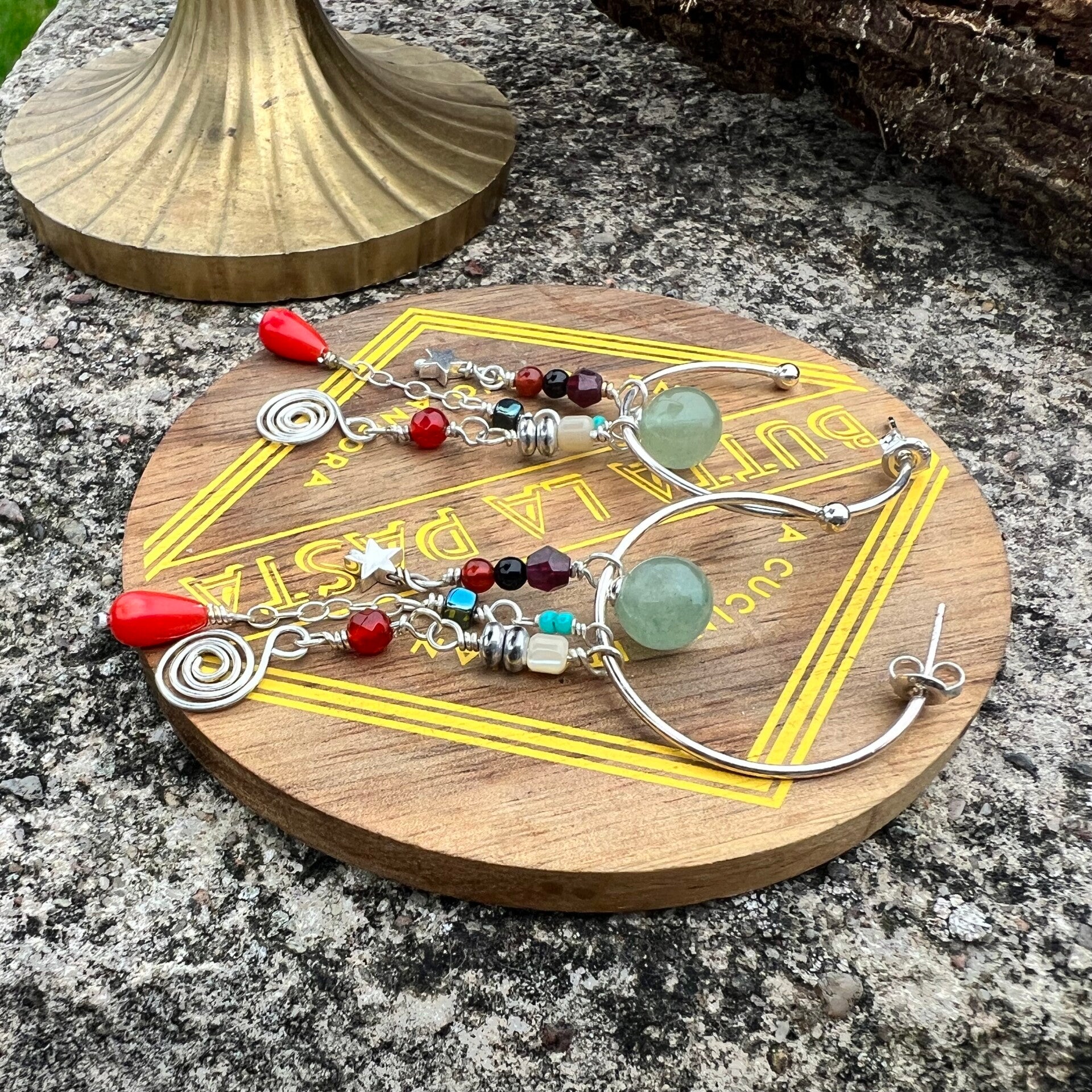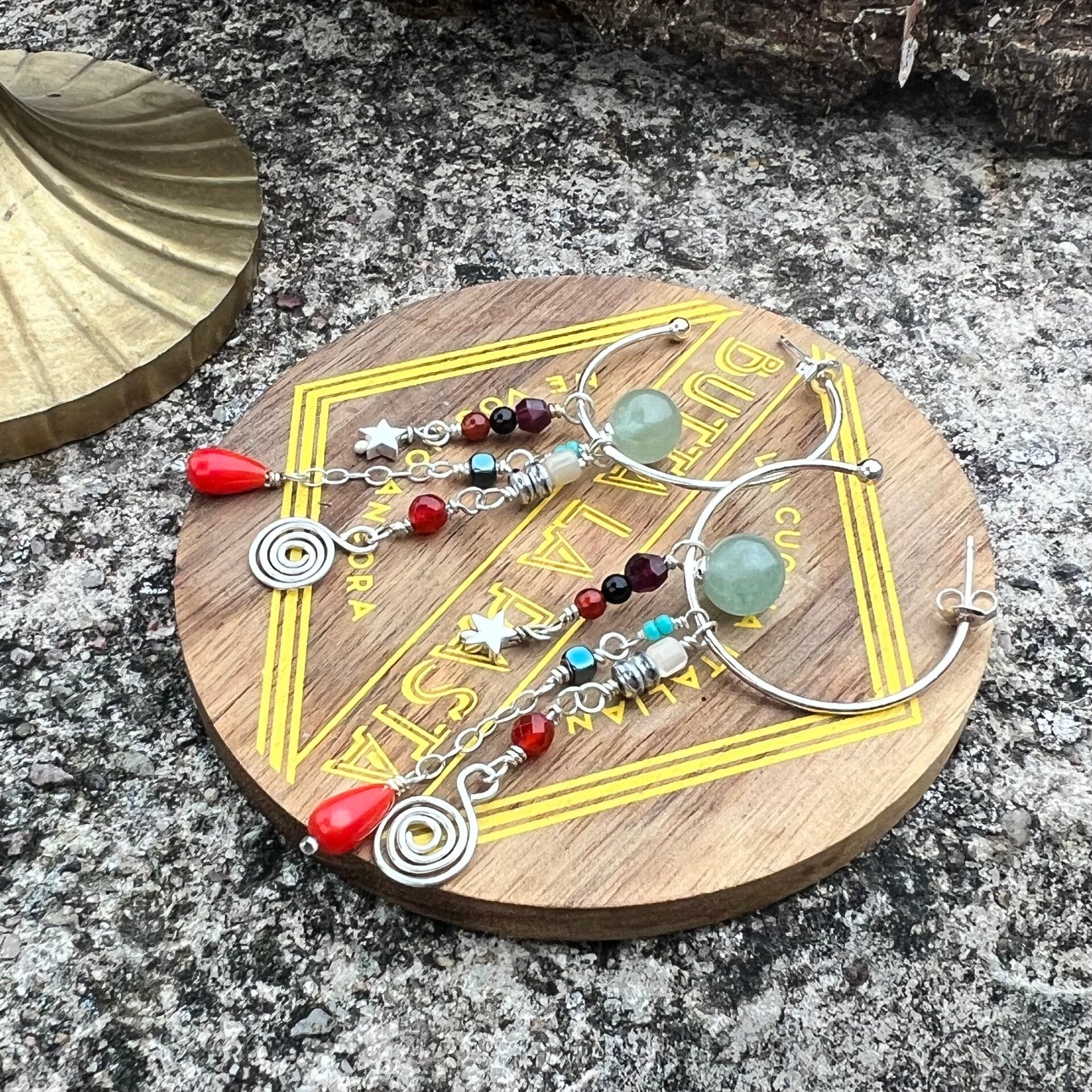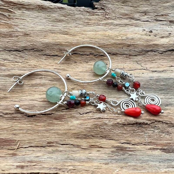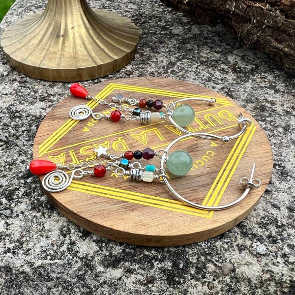 Dette skønne par Creole bringer liv og farver ind i ethvert outfit. De mange forskellige sten og farver skaber en spændende kontrast til det skinnende sølv, hvilket giver et unikt og iøjnefaldende udtryk. Midtpunktet er en elegant Aventurin-perle, som balancerer smukt på ringen og tilføjer en naturlig skønhed. Under ringen hænger tre fine strenge, hver med deres egne unikke detaljer, der bidrager til et sofistikeret og dynamisk look. Perfekt til både hverdag og fest, disse øreringe kombinerer tidløs elegance med moderne flair.
