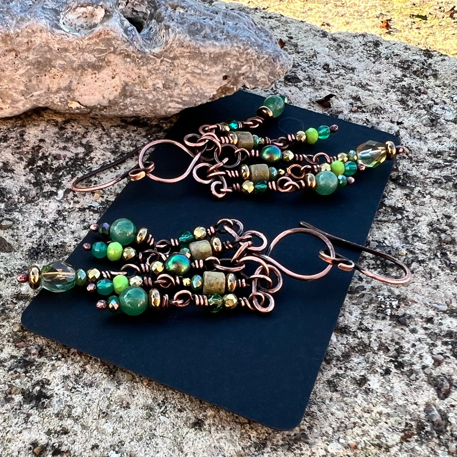 Materiale: Czech, krystal, Aventurin, Jasper, Swarovski krystal perle. Vintage oxideret og lakeret kobber.