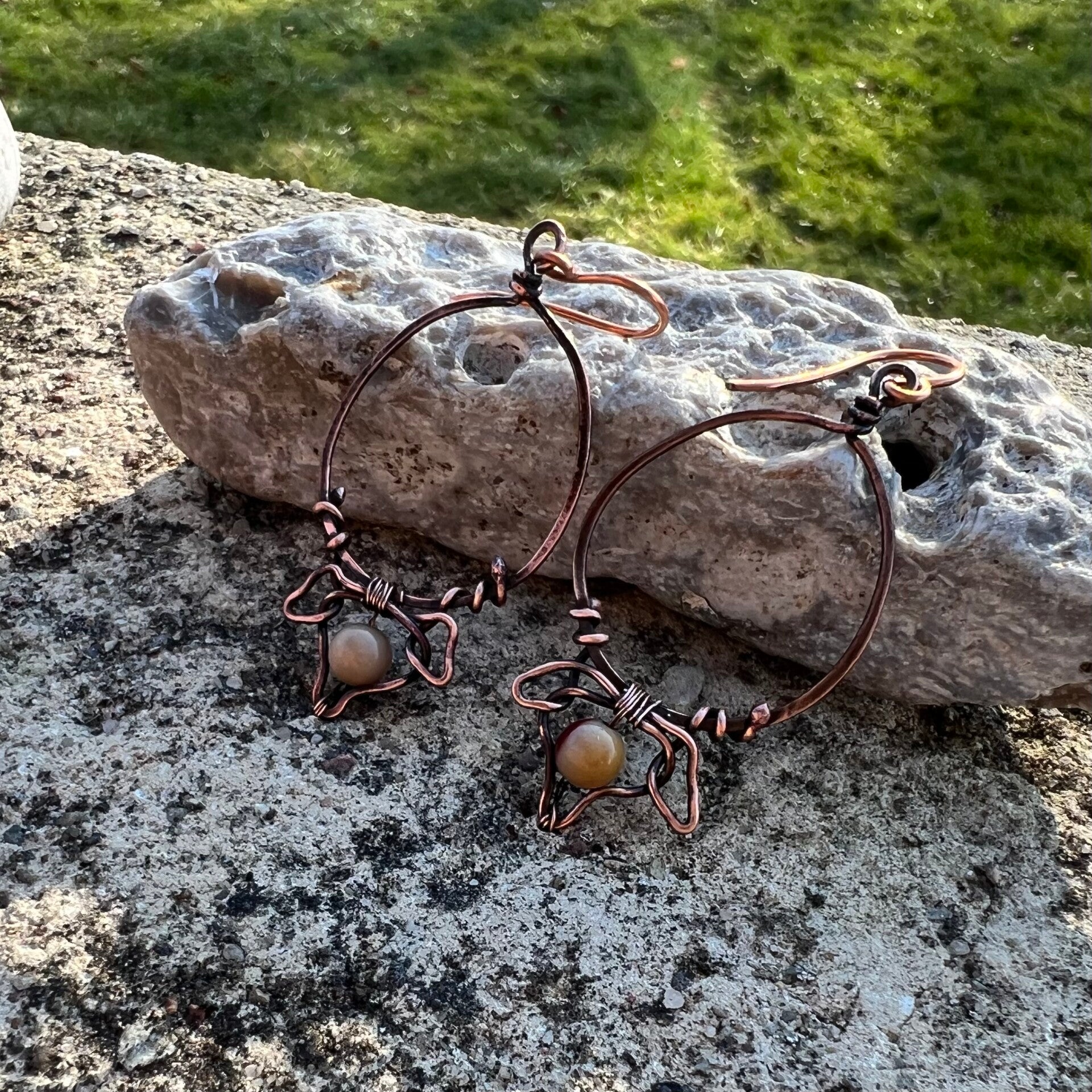 Er et unikt par øreringe, der kombinerer romantik og rå, organisk æstetik på smukkeste vis. Øreringene er håndformet med sans for de organiske træk, hvilket giver dem et helt særligt udtryk. De er udsmykket med indtagende mookaite-perler, der tilføjer varme og elegance til designet. Perfekte til dig, der ønsker et smykke med en balance mellem det naturlige og det raffinerede.