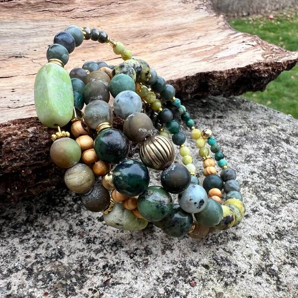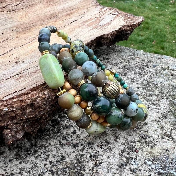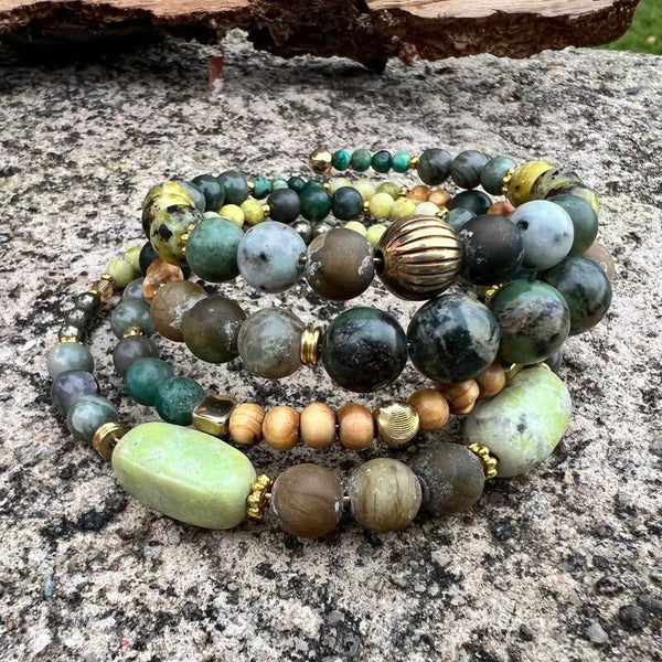 Materiale: Afrikansk Turkies (En art af Jasper) Agat, Green Grass Jasper, Wood Store, Krystal, Træ og forgylte dele.
