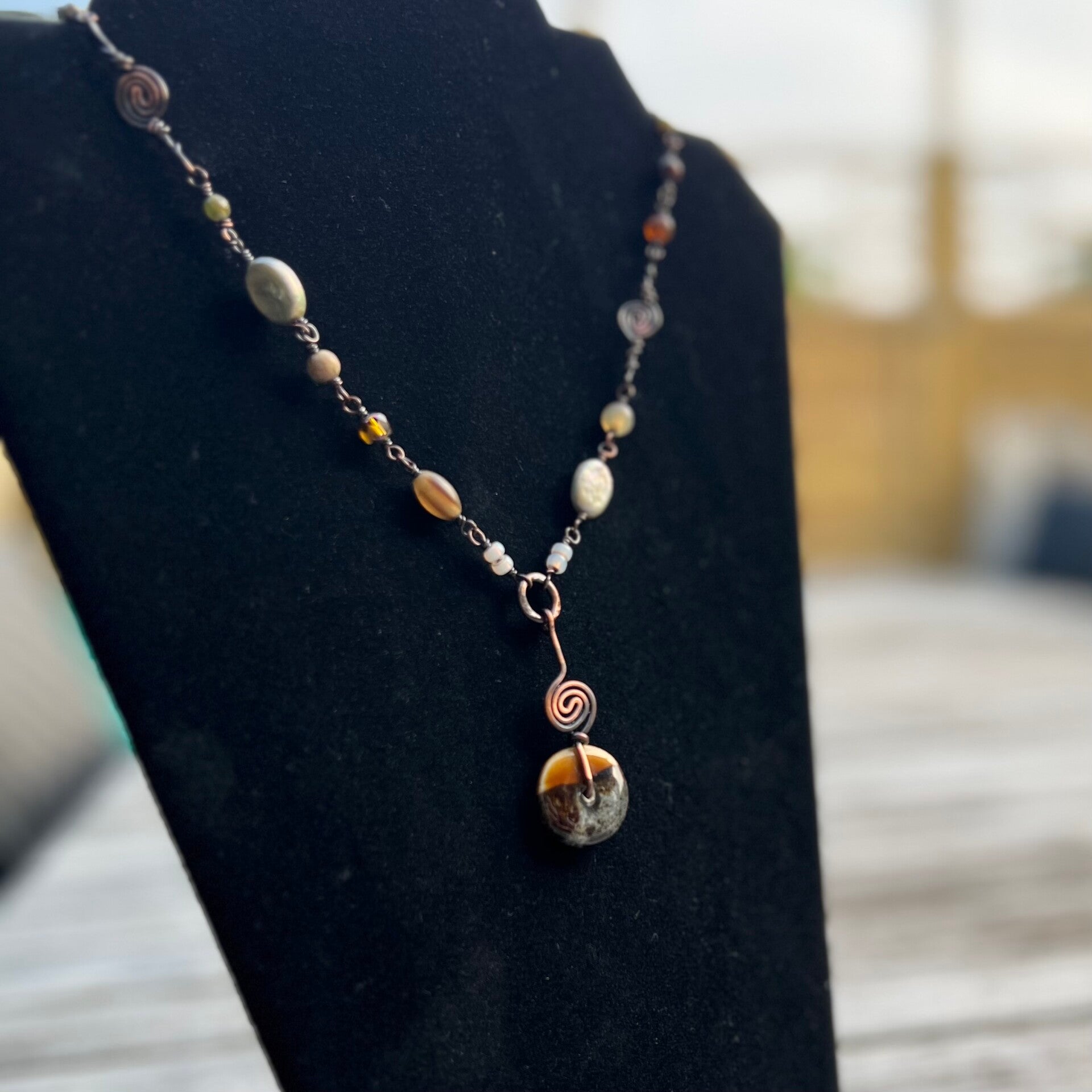 Hver perle er individuelt udvalgt for sin struktur og naturlige dybde, og alle kobberelementer er formet, oxideret og lakeret i hånden. Resultatet er et stykke smykkekunst med tydelig sjæl og håndværksmæssig finesse.