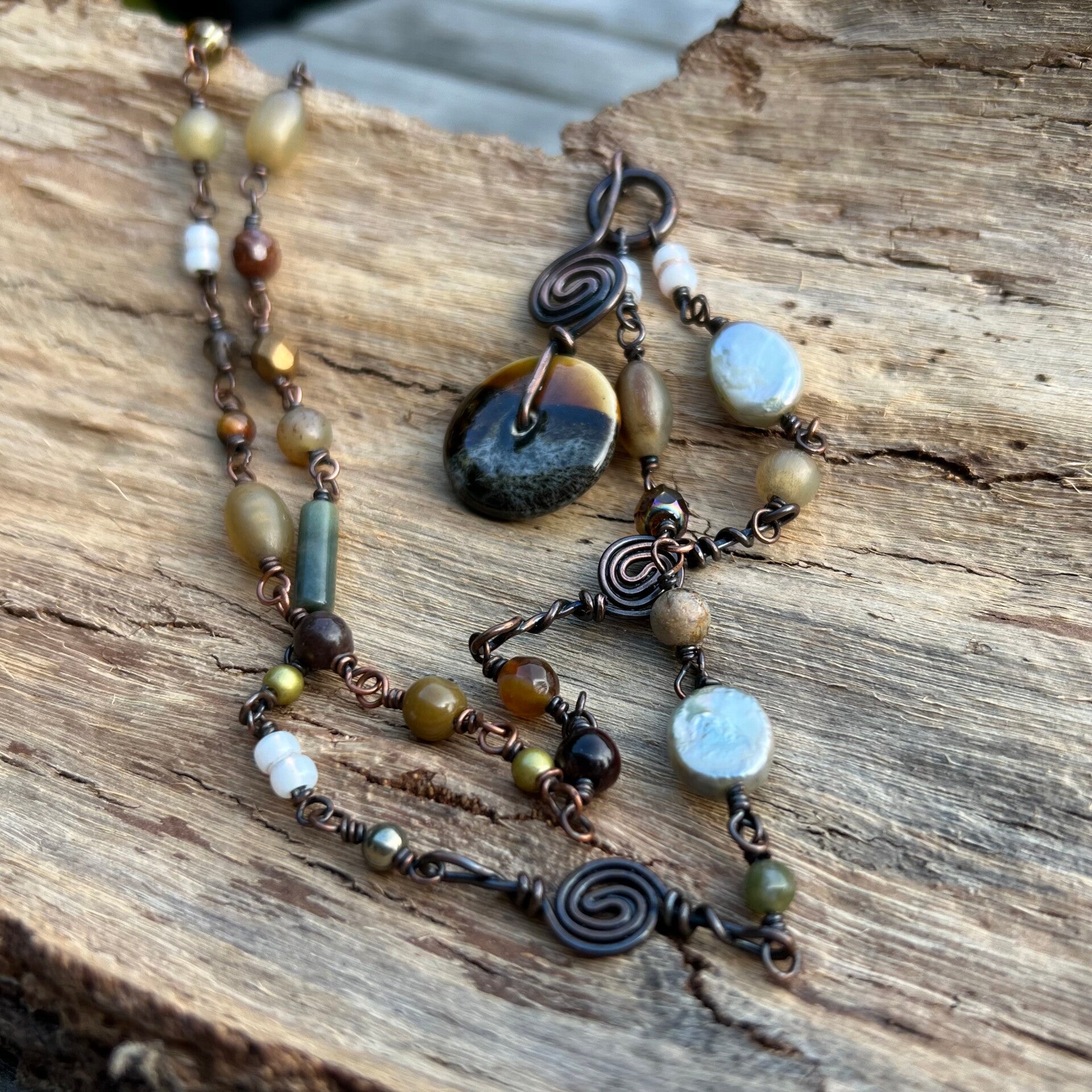 Smuk, håndlavet statement-halskæde i naturlige jordtoner