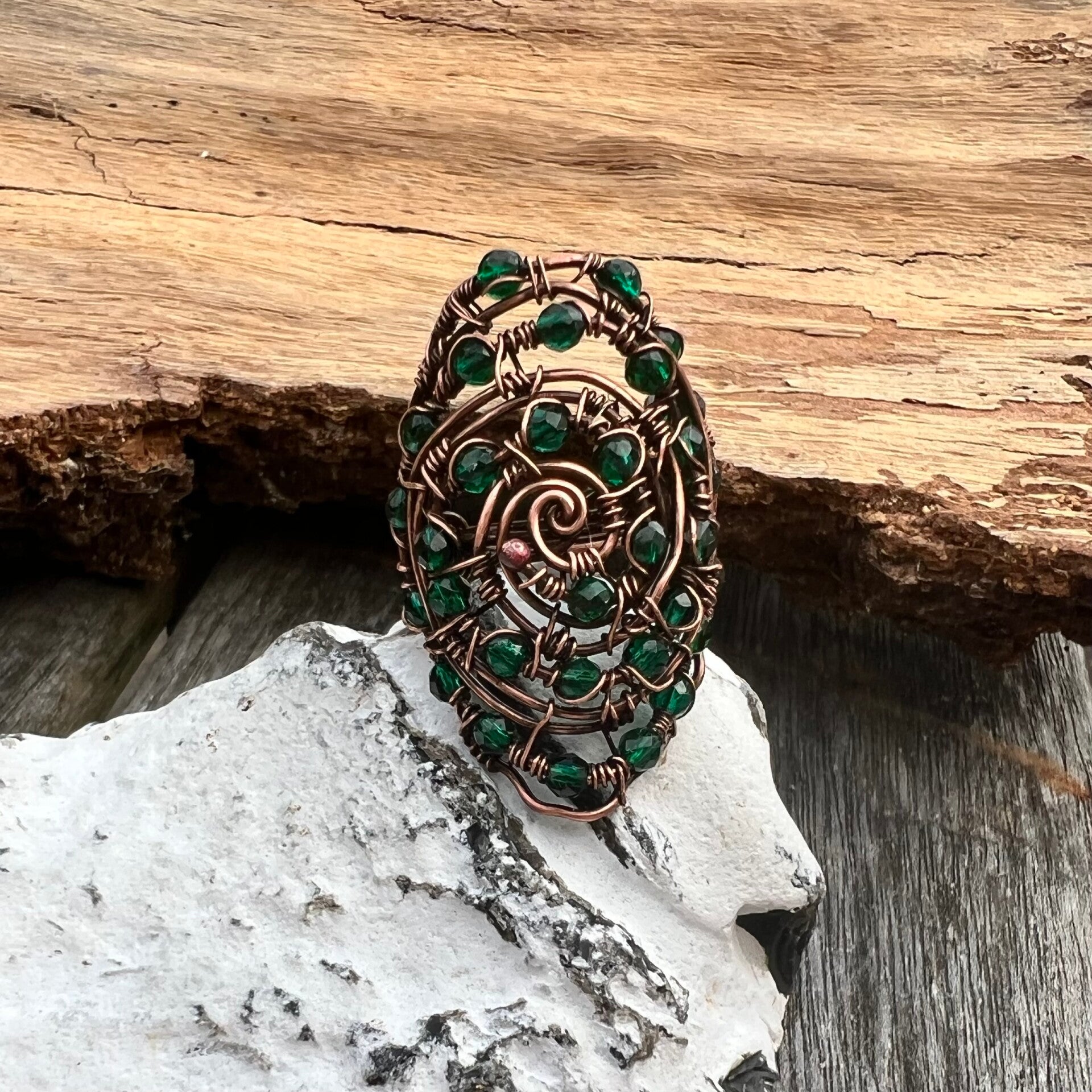 Ringen her er med emeral grønne krystal perler og i det smukke vintage kobber, som både er oxideret og lakeret.