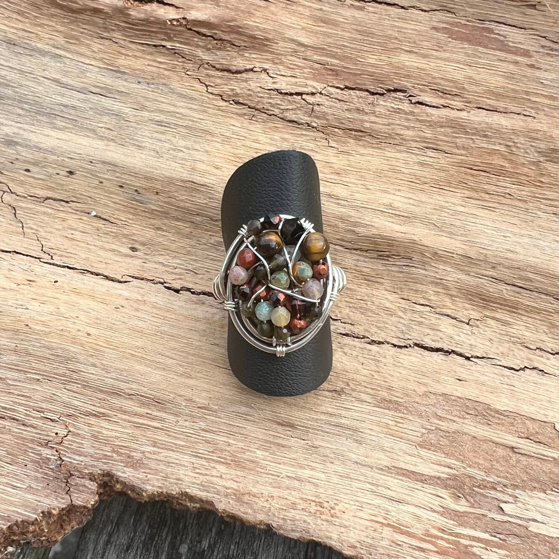 Jeg elsker at sætte farver sammen, og denne smukke ring er et perfekt eksempel på det! Aurora Cluster - Skadi er en fest af farver og detaljer, hvor et hav af smukke krystaller skaber et harmonisk og iøjnefaldende design. Blandt stenene finder du bl.a. Tigerøje, Indisk Agat og smukke krystaller, der alle er nøje udvalgt for deres unikke skønhed. Hver sten er omhyggeligt viklet med ægte sterlingsølv, hvilket giver ringen et elegant og gennemført udtryk. Dette er et Unika-design, hvilket betyder, at der kun findes én som denne – helt unik, præcis som dig!