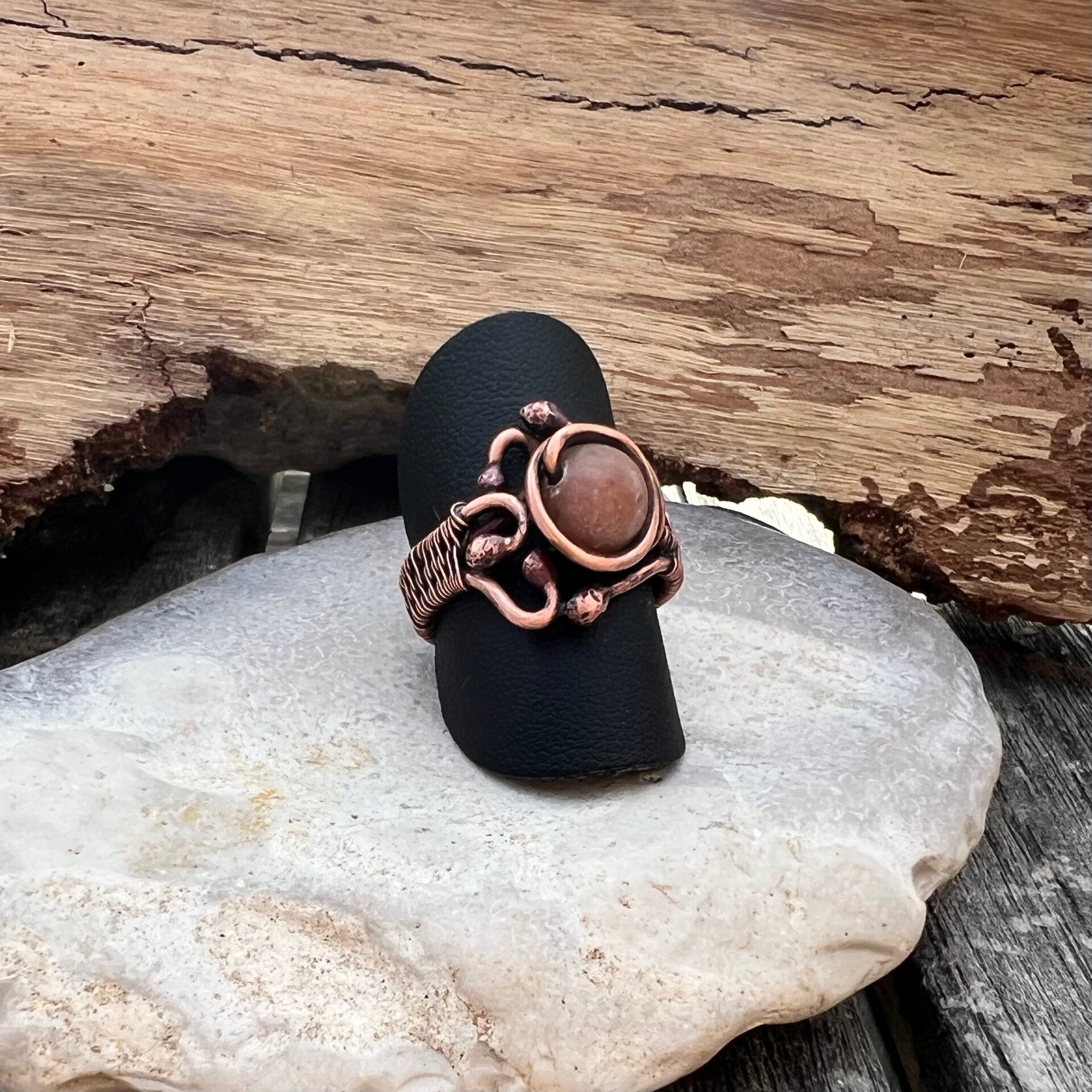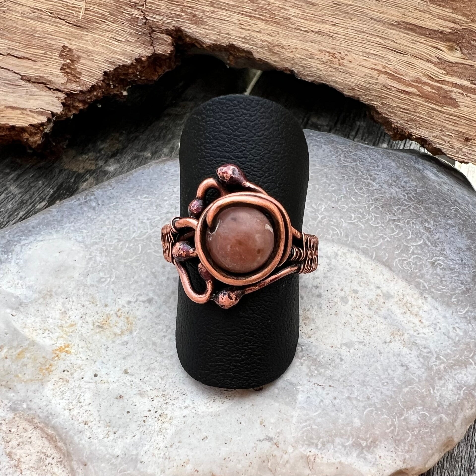 Oplev skønheden ved denne unikke ring, der kombinerer tidløs elegance med håndværksmæssig finesse. Her finder du en smuk marmorperle, omhyggeligt viklet med vintage kobber, som skaber en charmerende kontrast og et raffineret udtryk. Ringen er designet med mange fine detaljer, der gør den til et ægte blikfang. Perfekt til dig, der ønsker at tilføje lidt ekstra karakter til din stil og tiltrække opmærksomhed på den mest elegante måde.