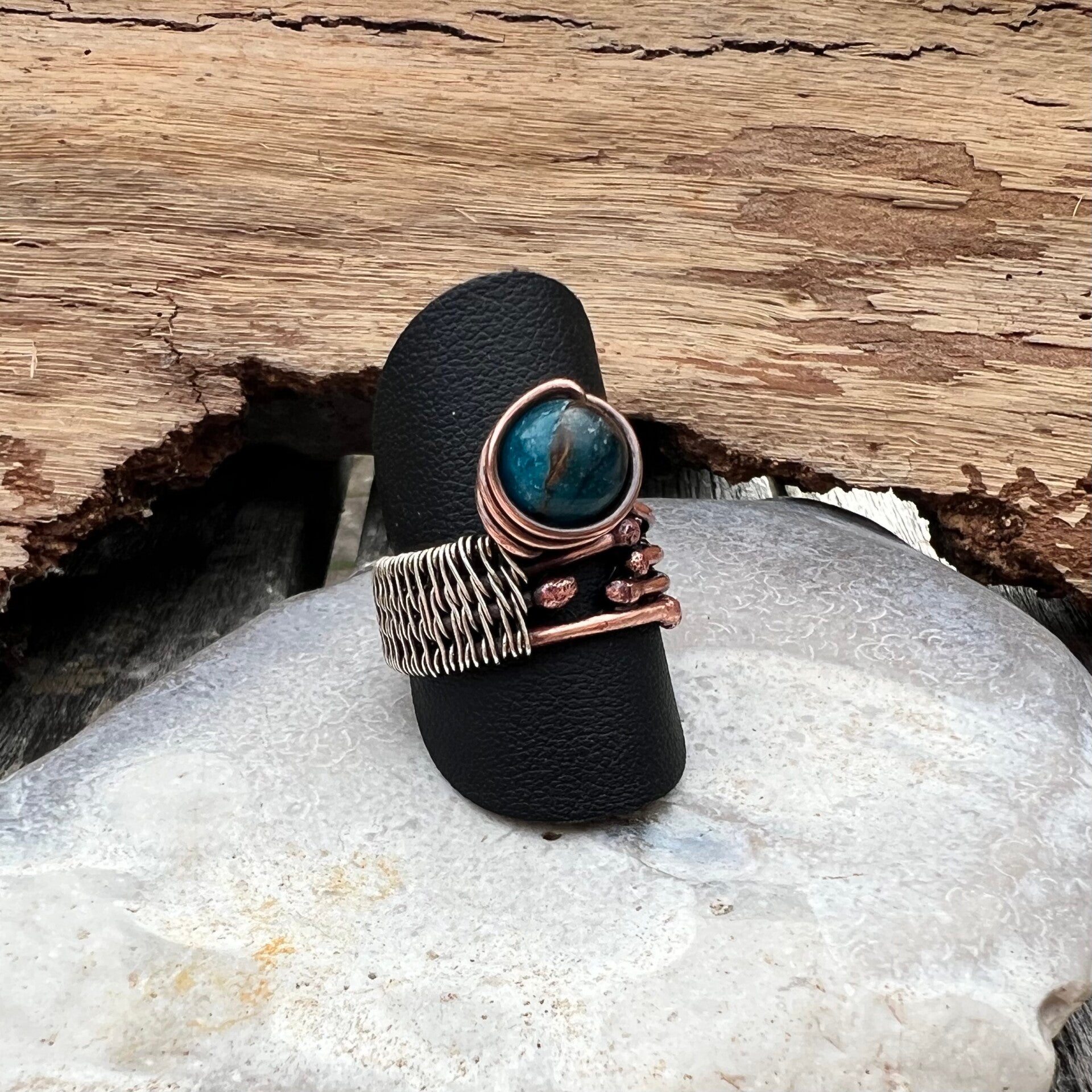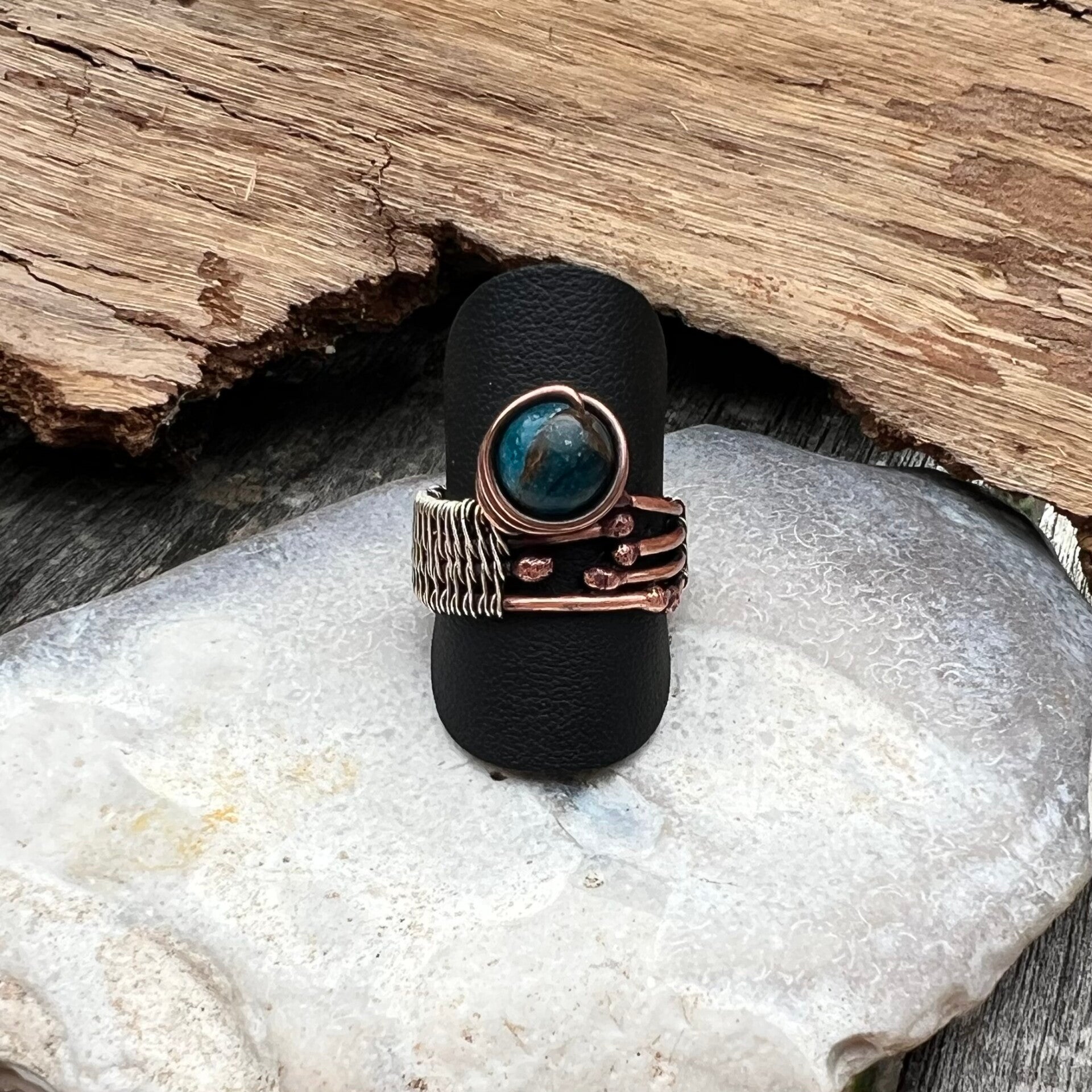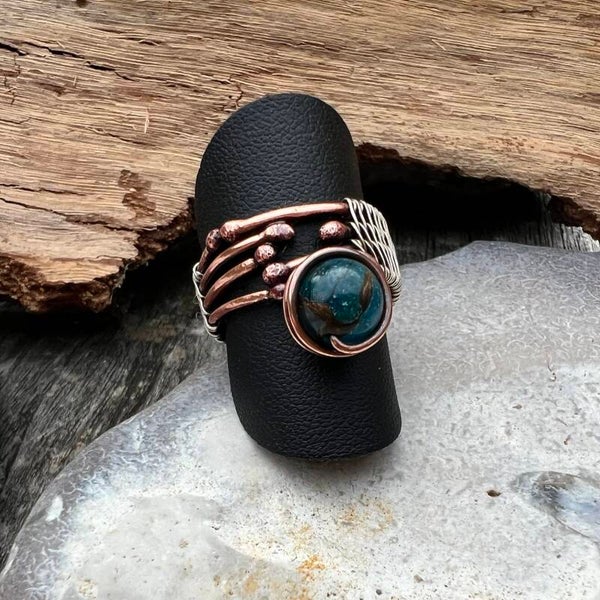 Denne ring er intet mindre end fantastisk. Jeg har kombineret det bedste fra både sølv og kobber, som er nøje viklet og vævet sammen for at skabe et unikt og smukt design. Midtpunktet i ringen er en fortryllende Kalcedon-perle, der med sin naturlige skønhed tilføjer elegance og charme. Skaftet er omhyggeligt vævet med sterling sølv, hvilket sikrer både holdbarhed og et eksklusivt udtryk. Dette er ikke bare en ring – det er et lille kunstværk skabt med kærlighed og præcision.
