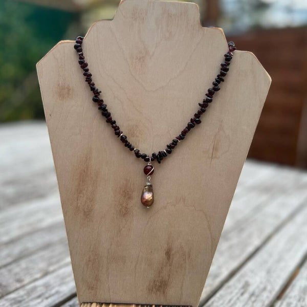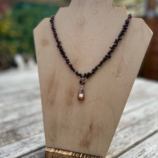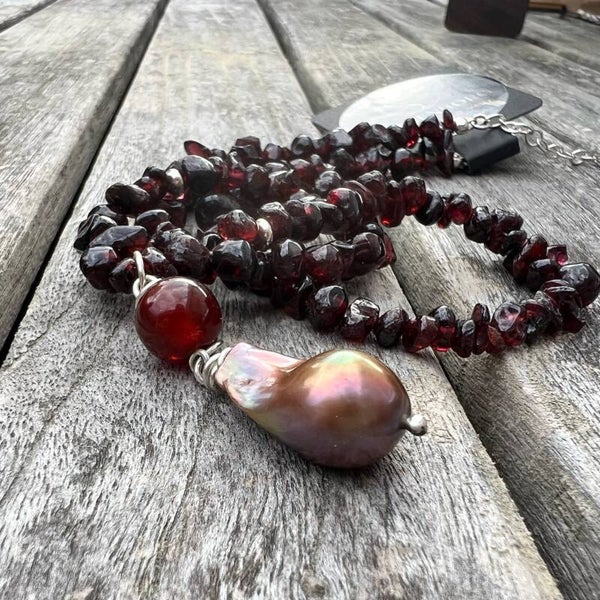 Elegant Halskæde med Granat, Rav og Ferskvandsperle
