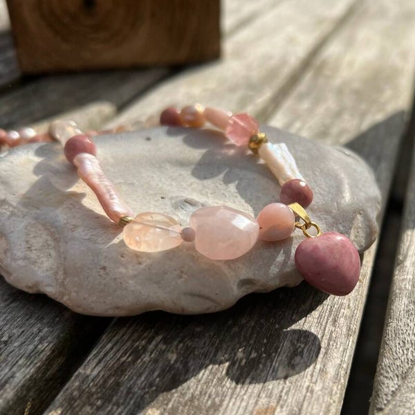 Materiale: Rhodonit, Quartz, Pink opal, Ferskvandsperler, Forgylt s.925