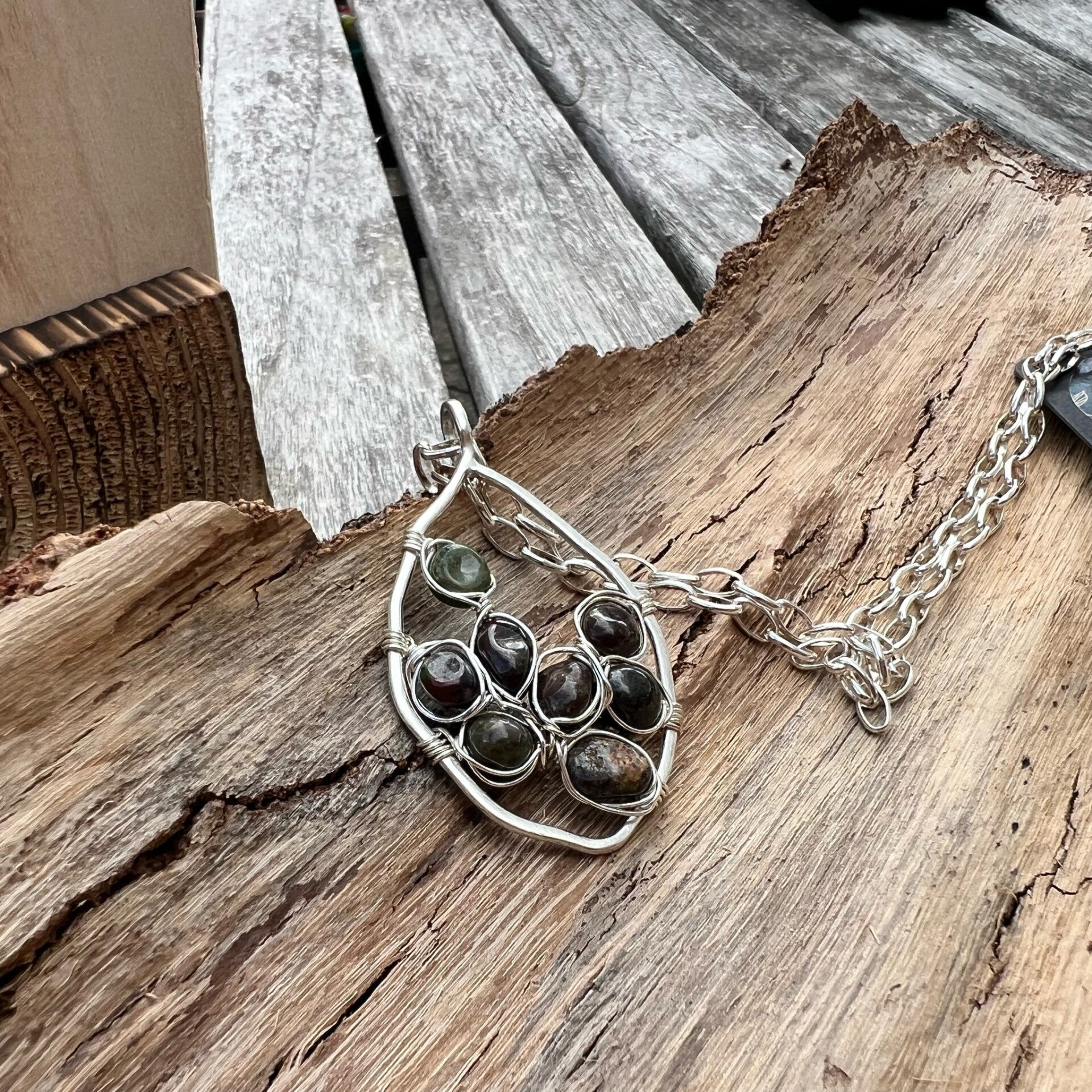 Denne halskæde er skabt med kærlighed til naturens detaljer. Vedhænget prydes af et håndformet og unikt blad, sirligt udsmykket med de betagende Dragon Blood Jasper-sten, der tilfører et strejf af rå elegance. Halskædens kraftige kæde med ovale led giver et robust og stilfuldt udtryk, som komplementerer det naturlige design. Fremstillet i høj kvalitets Sølv 925, sikrer halskæden både holdbarhed og et tidløst udseende. Perfekt til dig, der ønsker smykker med sjæl og historie.