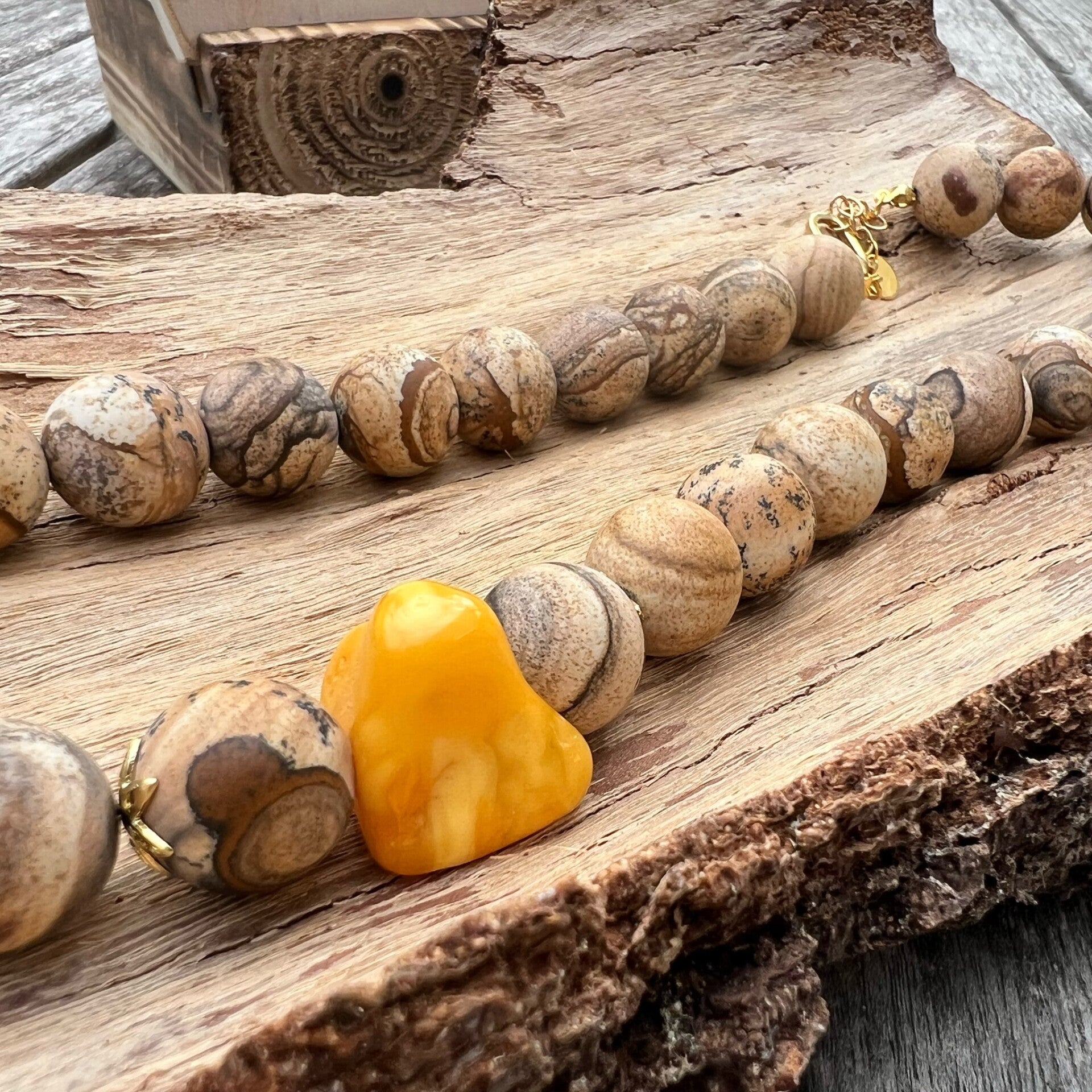 Materiale: Mælkerav (en sjælden og unik form for rav), Jasper, Forgylt s925.