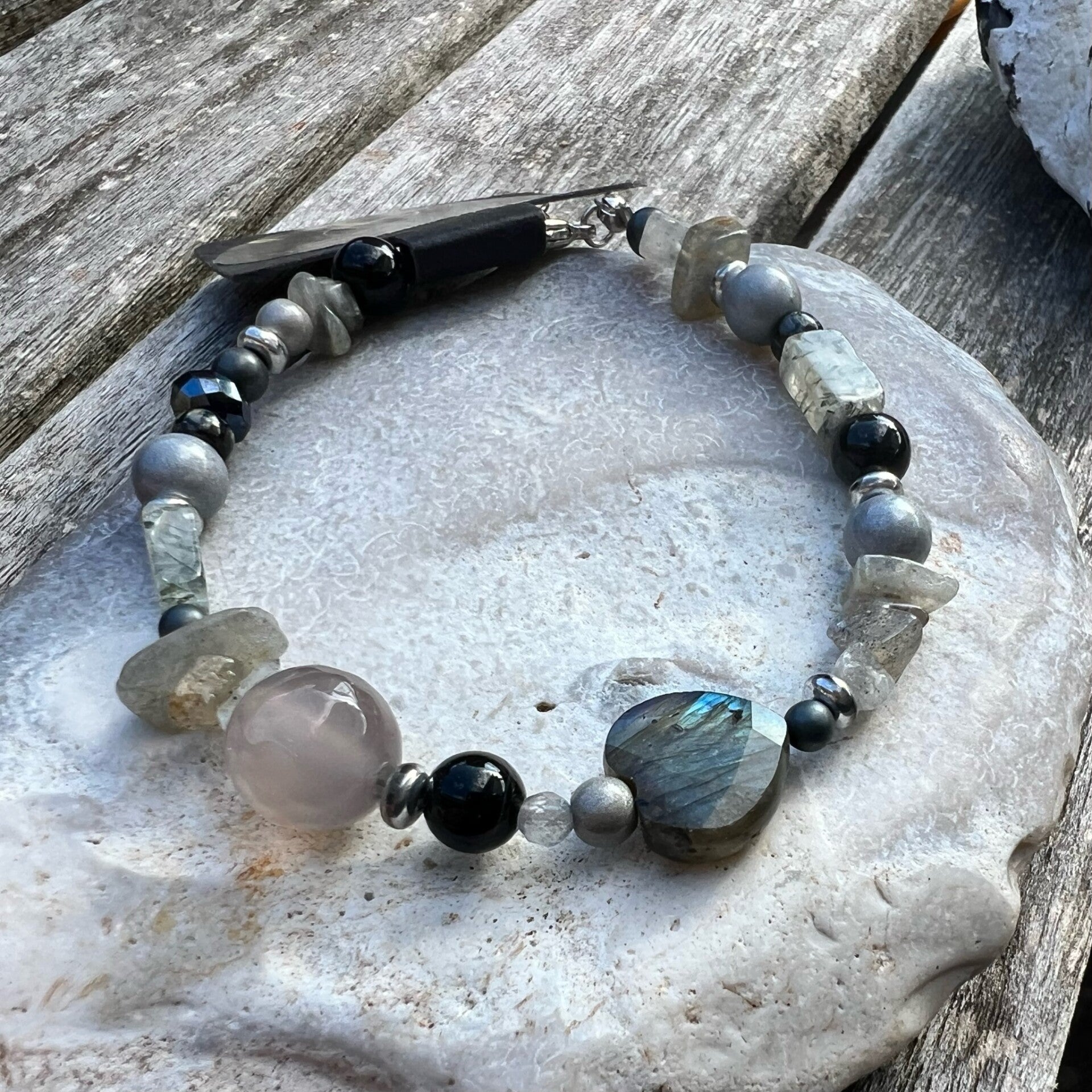Smuk armbånd i neutrale farver, men dramatisk i sit udtryk. Labradorit hjertet er let facetslebet og utrolig smukt.