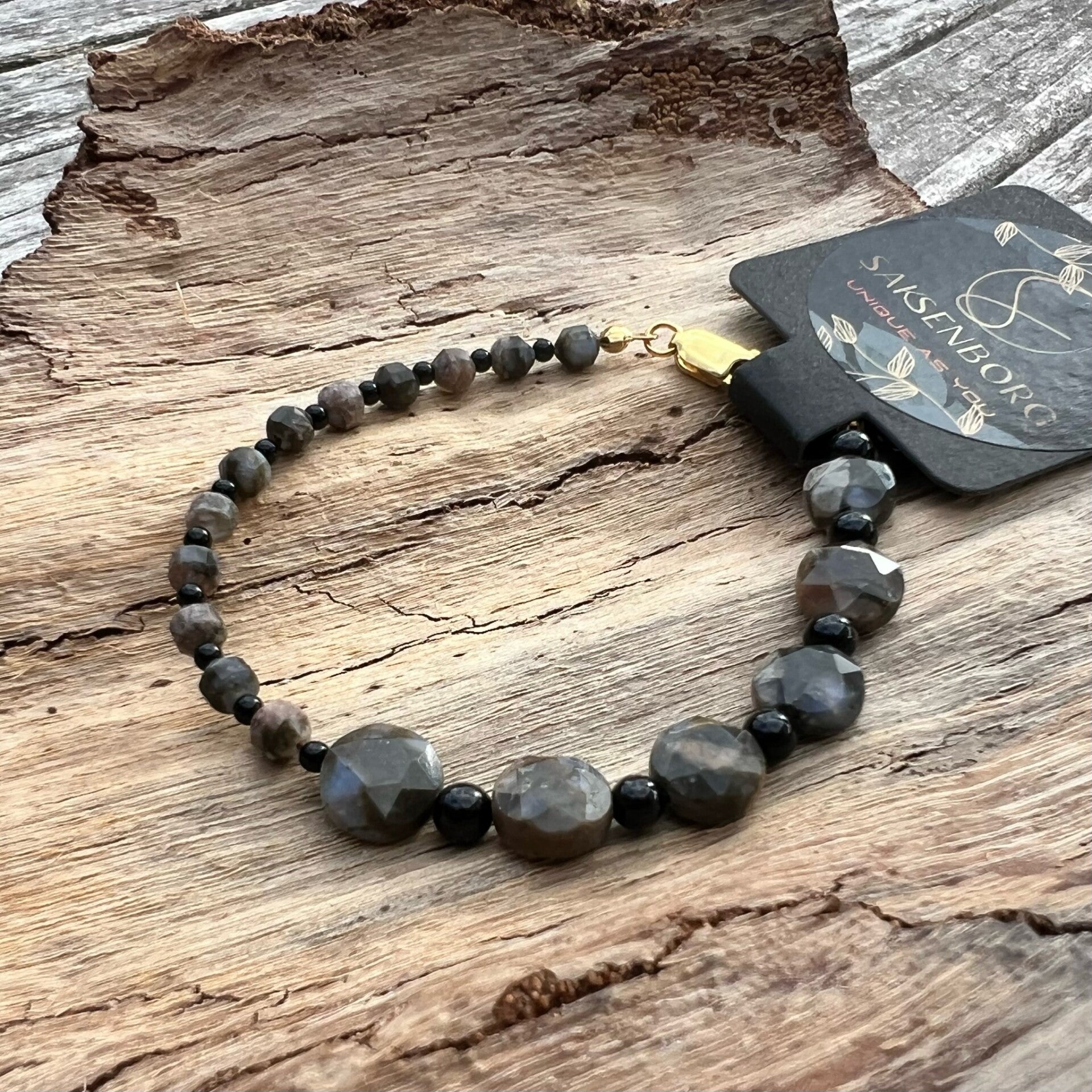 Dette armbånd er designet med de smukke Glaucophane perler, med farver i sort, grå/blå, i mellem er der de smukke sorte Onyx. Lås og kæde i Forgylt s.925.