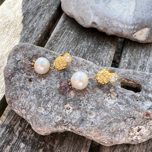 Dette skønne par, er både klassiske og våget. En smuk støbt ørestikke med en smuk Zirkon, herunder en smuk ferskvandsperle og efterfulgt at facetslebet Ametyst.