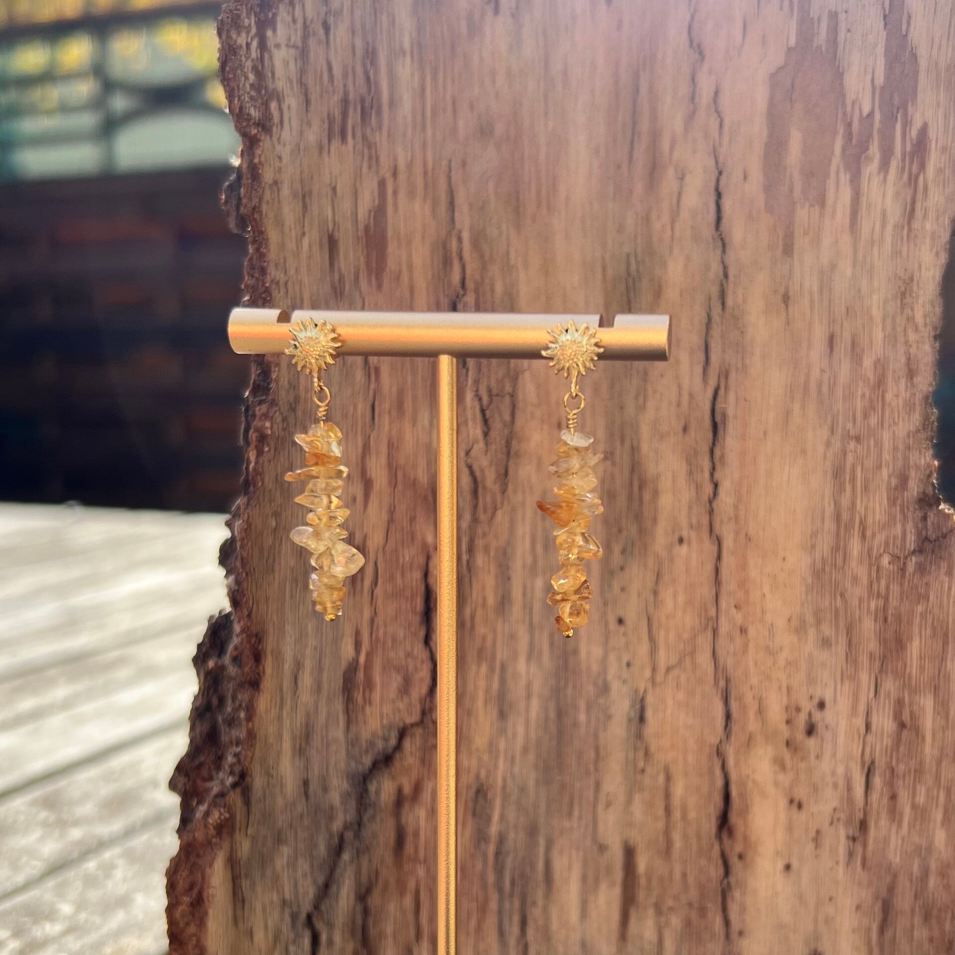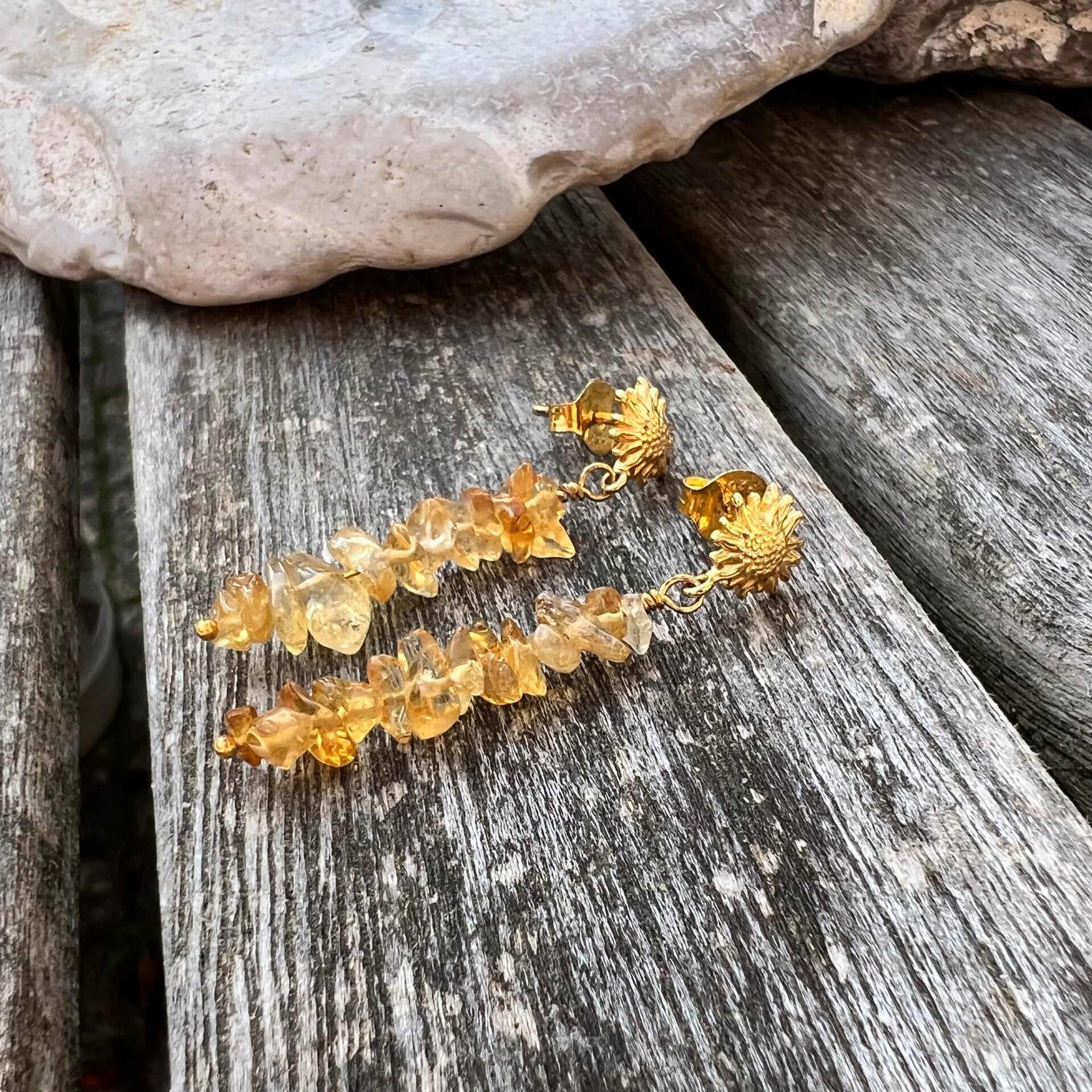 Et smukt par, som stråler og reflektere smukt i lyset. Ørestikken er formet som en smuk blomst, der passer godt til den nærmest solgule Citrin.