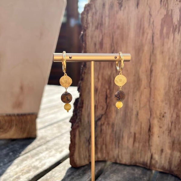 Dette fantastiske par, er fremstillet med de smukke mælkerav perler og den smukke matte Jasper. Det hele med forgylt s925.