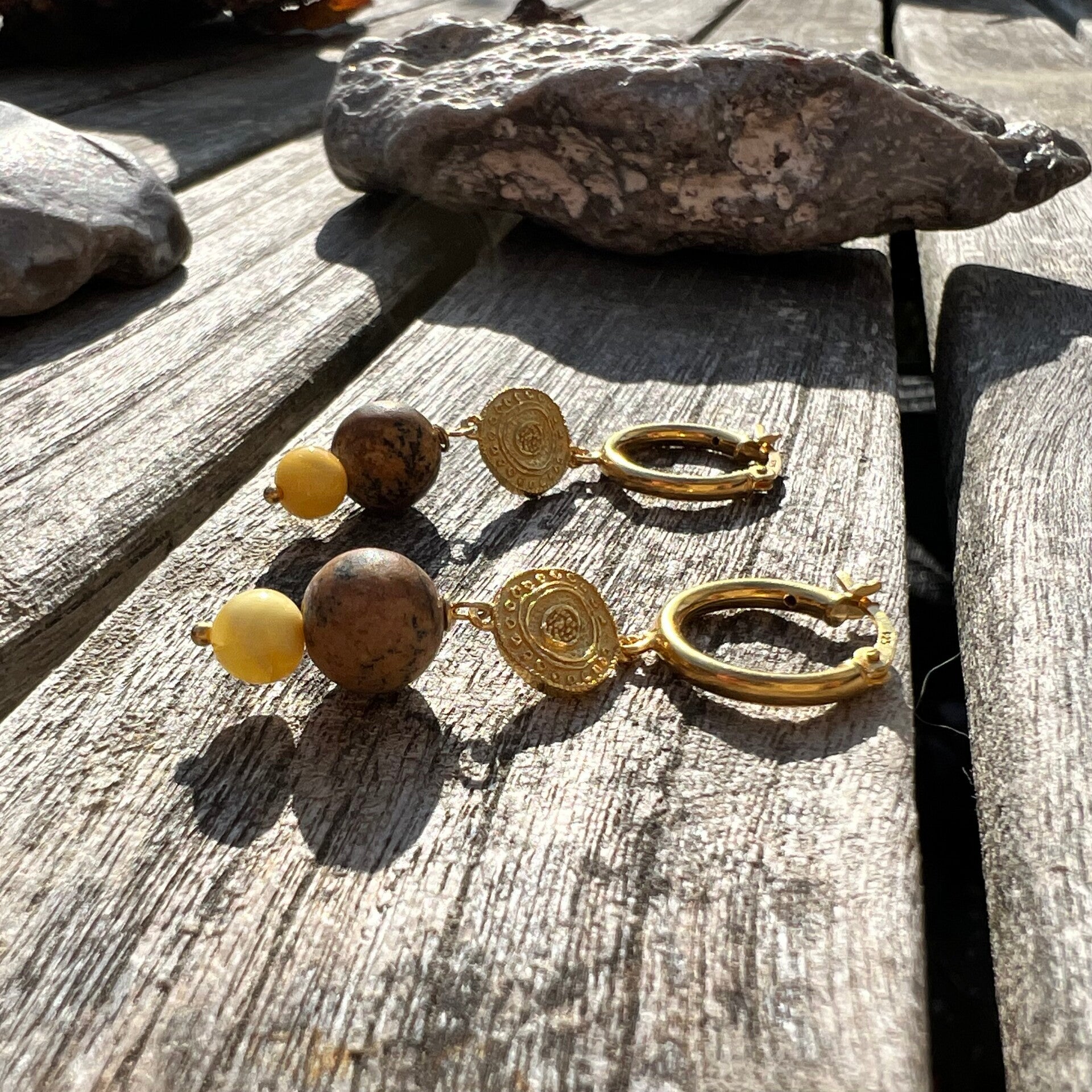 Materiale: Mælkerav (En sjælden og unik for for rav) Jasper/Jaspis, Forgylt s925.