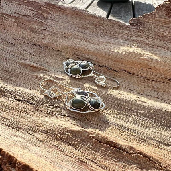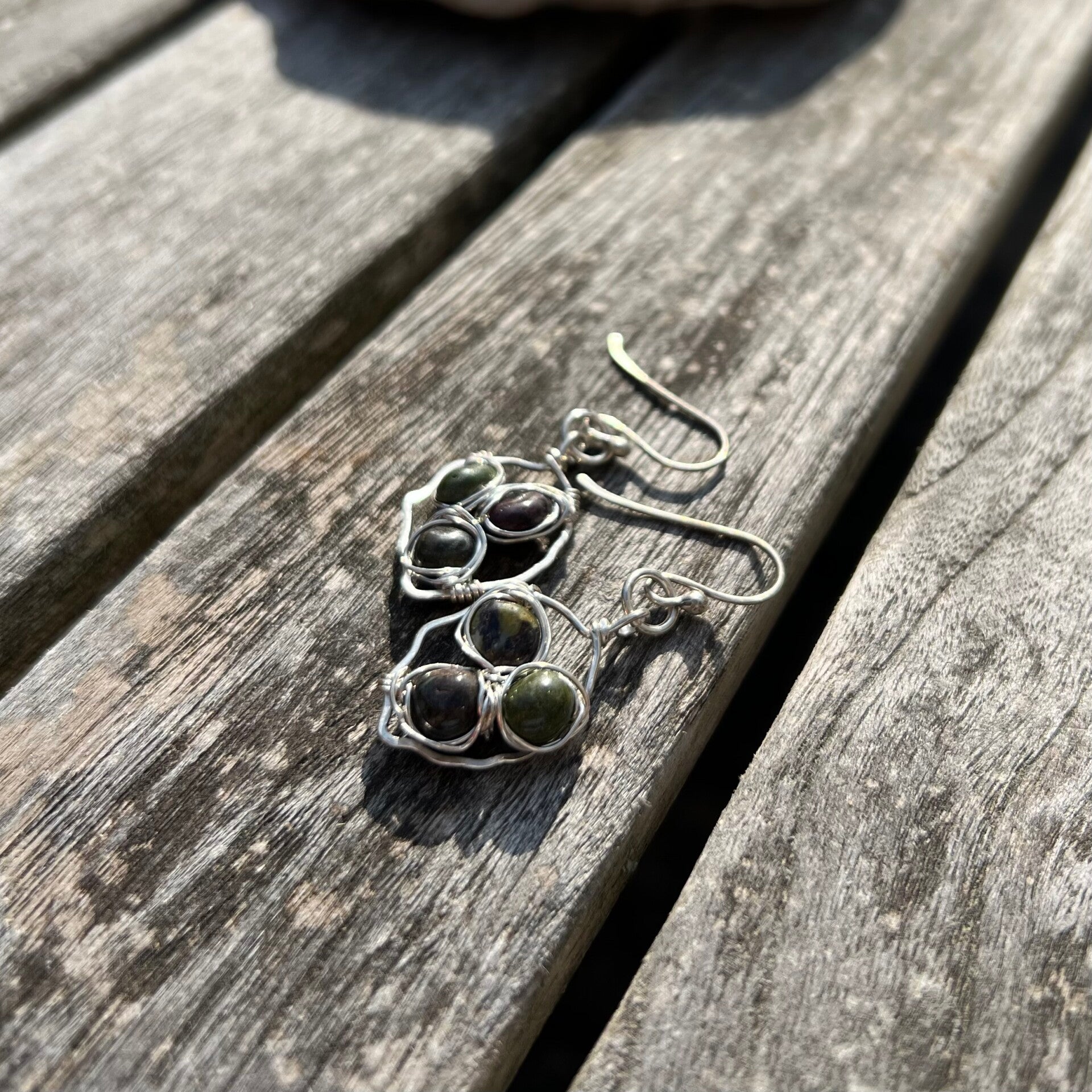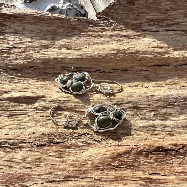 Dette par, er håndformet, med blik på naturen, i det rustikke "blad" finder du indvævet Dragon blood jasper, i deres smukke naturlige farve (grøn/rød/brun) Bestemt et unikt par du ikke finder igen.