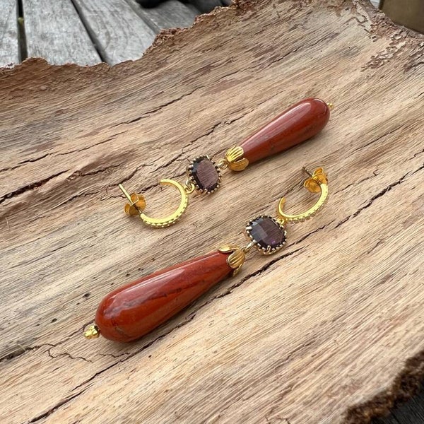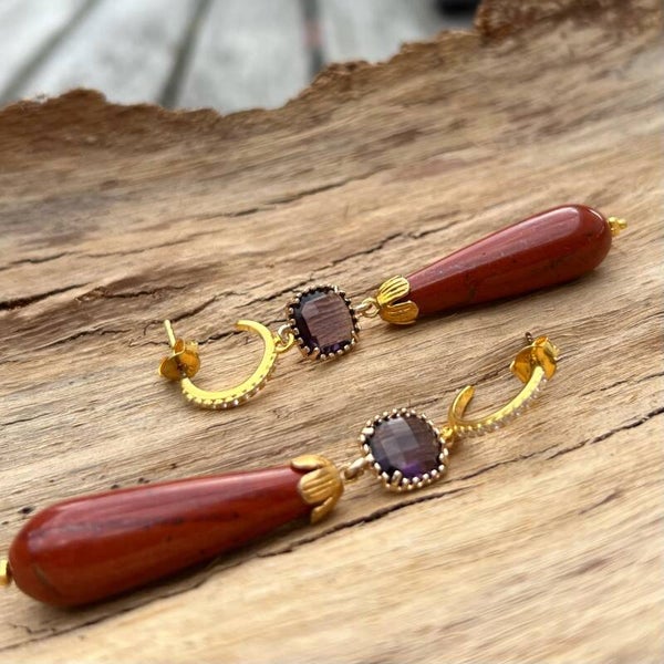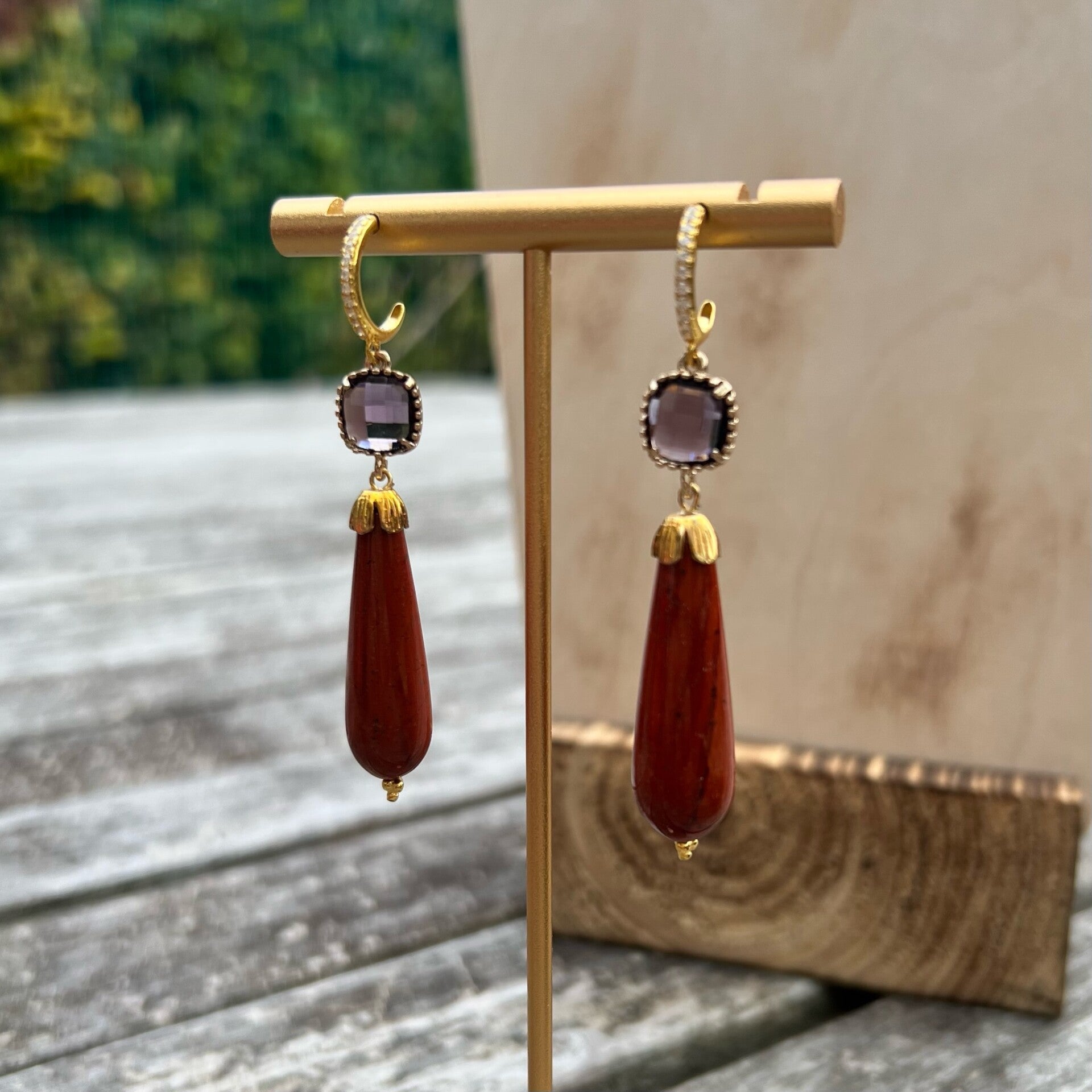 Dette skønne par, er med smukke røde Jasper dråber, herover en smuk lilla krystal (Ametyst farve) og ørestikken er fyldt med Zirkon. Bestemt et smukt og unikt par.
