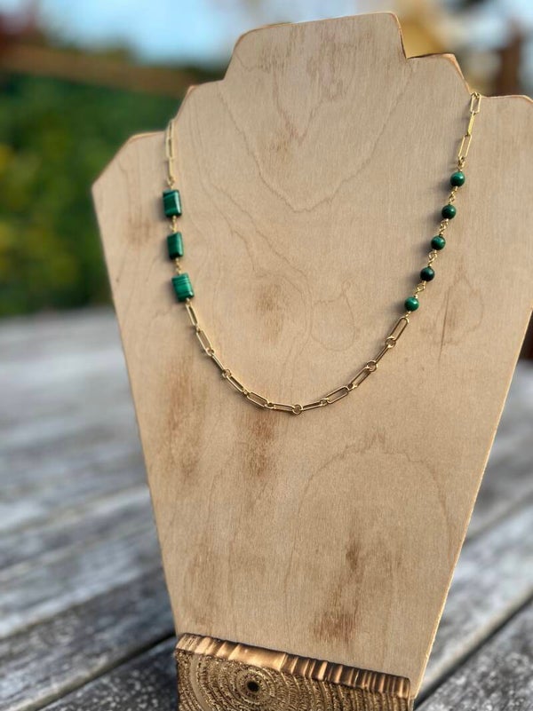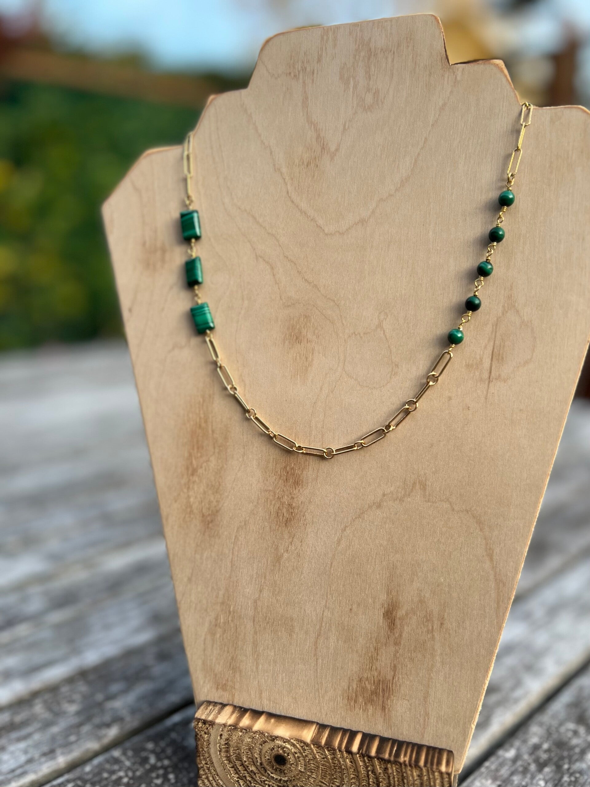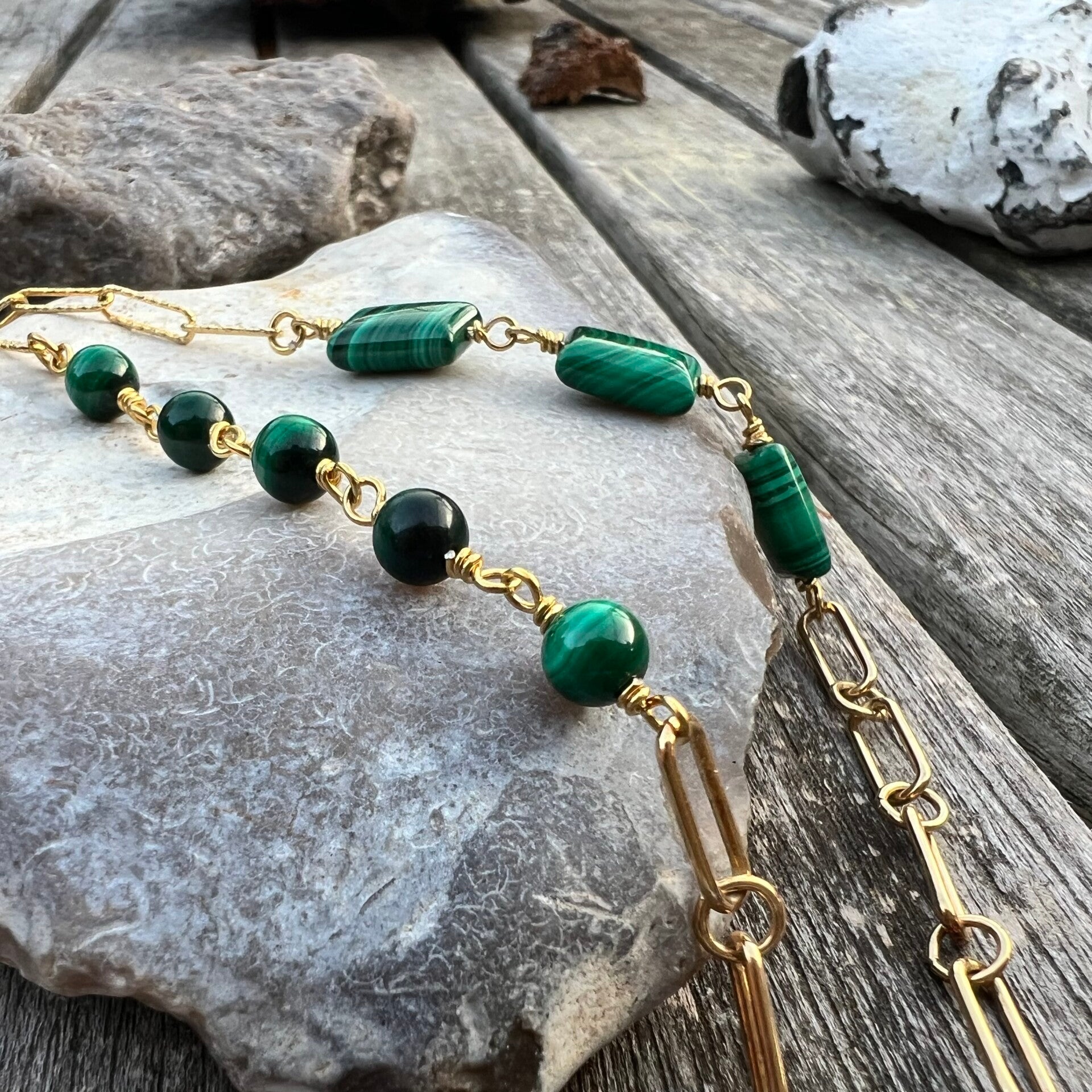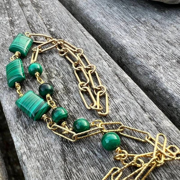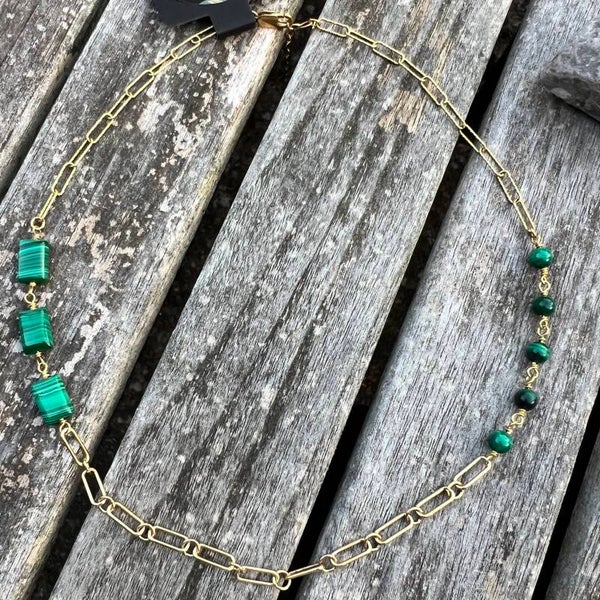 Denne smukke halskæde er med de smukkeste Malakit, hver gang jeg arbejder med denne sten, så er jeg imponeret over at naturen kan skabe så smuk en krystal! Man siger jo, finder man Malakit, så finder man guld. Her er den designet med forskellige kæder og form på krystallerne.