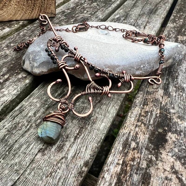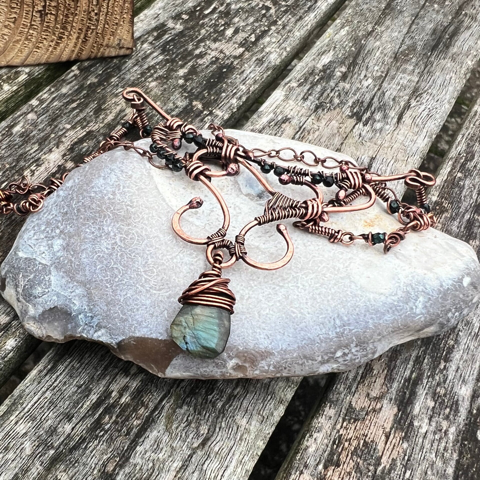 Den smukke labradorit, der hænger i centrum, skifter farve i lyset med blå og gyldne flammer – et naturfænomen, der giver smykket en levende og næsten magisk karakter. De små facetslebne Czech-perler tilføjer glans, mens den oxiderede og lakerede kobbertråd giver et råt, antikt og ægte udtryk.