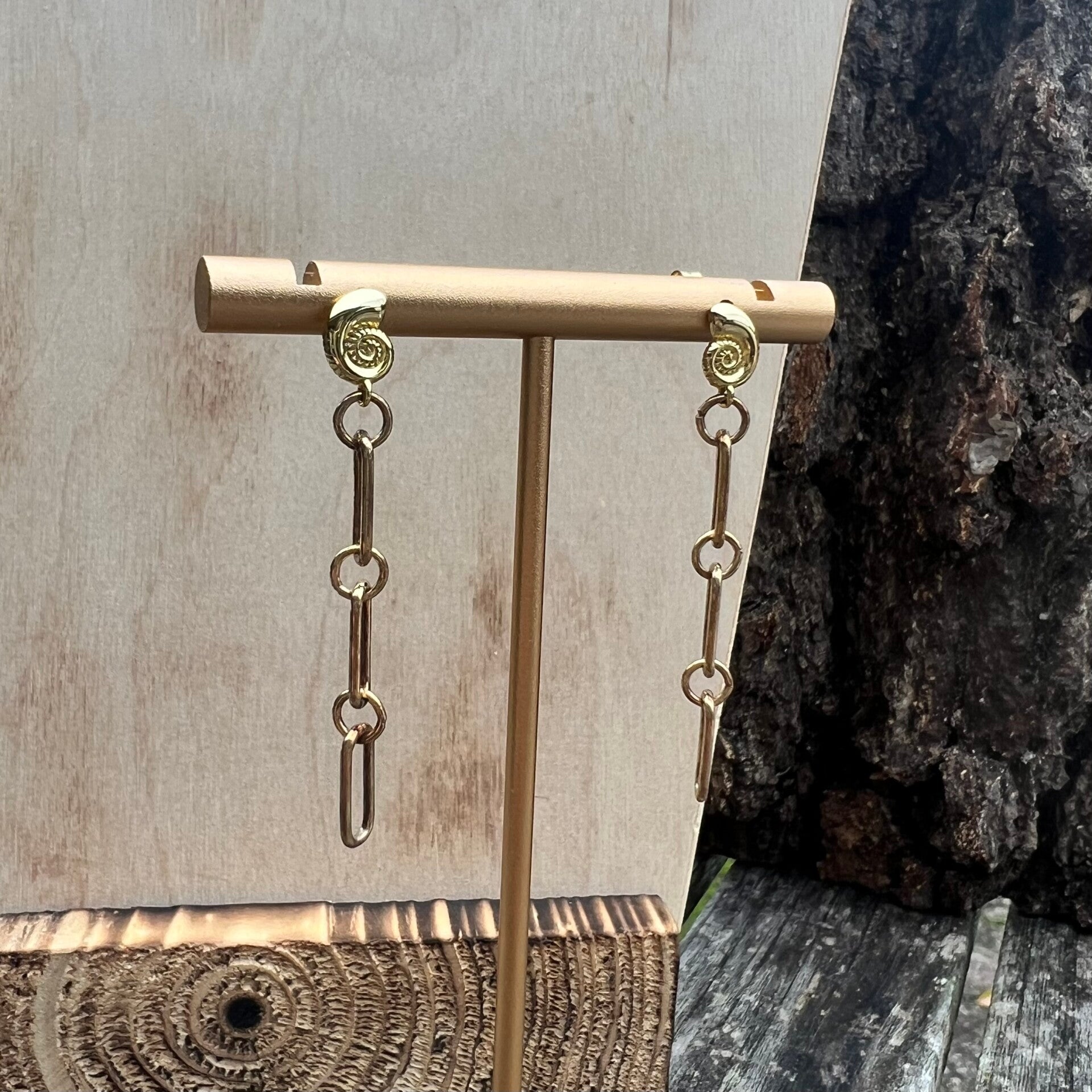 Oplev dette skønne par øreringe, der kombinerer elegance med et unikt design. Ørestikkerne er formet som smukke muslinger, hvilket giver dem et naturligt og eksklusivt udtryk. Under muslingerne hænger en smuk, let grov kæde, der skiller sig ud med en spændende kombination af rektangler og cirkler. Disse detaljer gør øreringene til et udsøgt valg, der kan tilføje et ekstra pift til ethvert outfit. Uanset om du er til et klassisk eller moderne look, er disse øreringe det perfekte valg til at vise din personlige stil frem.