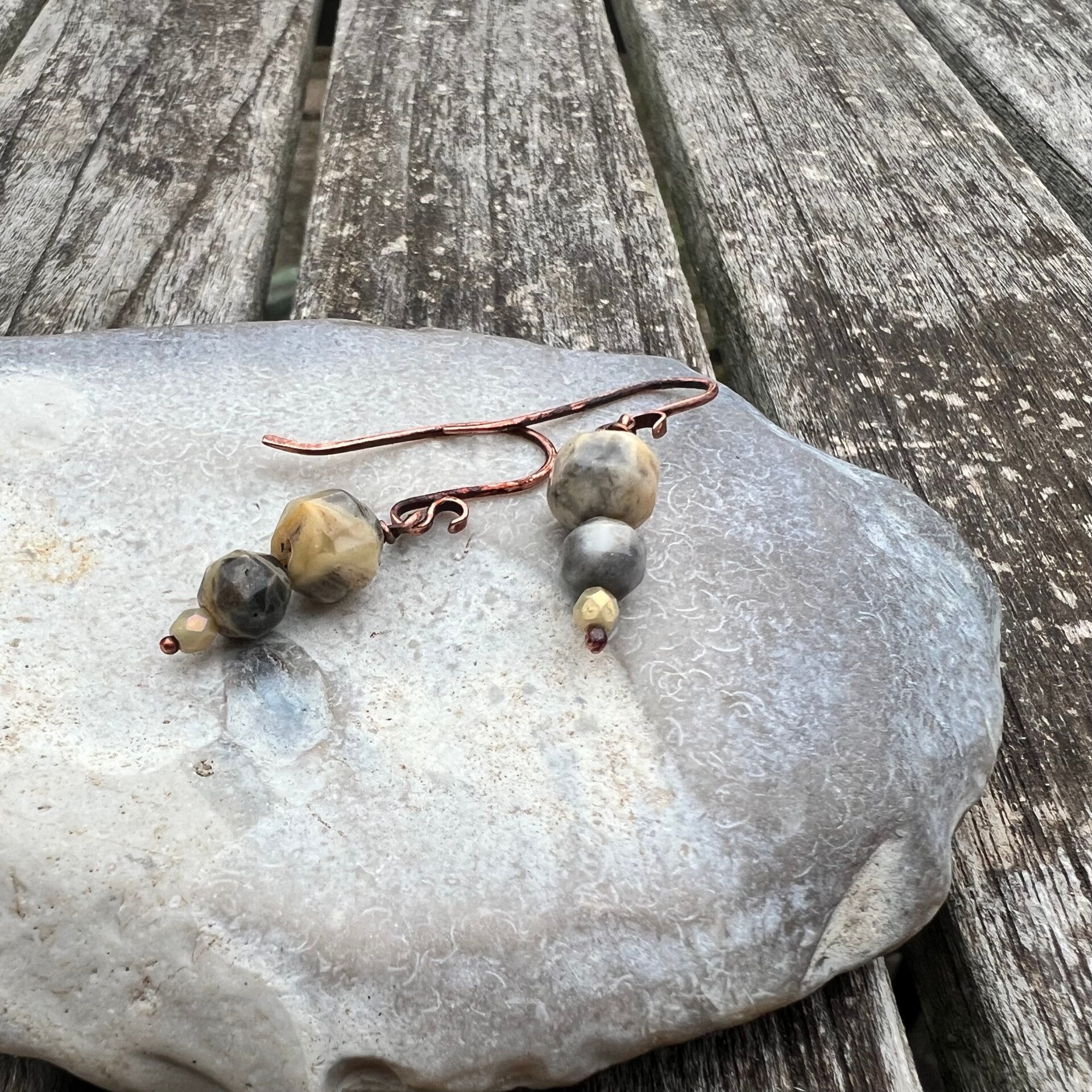 Ørekrogene er formet i vintage kobber, der er oxideret og lakeret for at bevare det varme, antikke look. Resultatet er et par tidløse øreringe, der passer perfekt til både hverdag og særlige lejligheder.