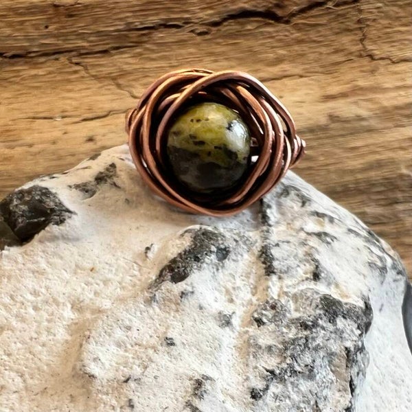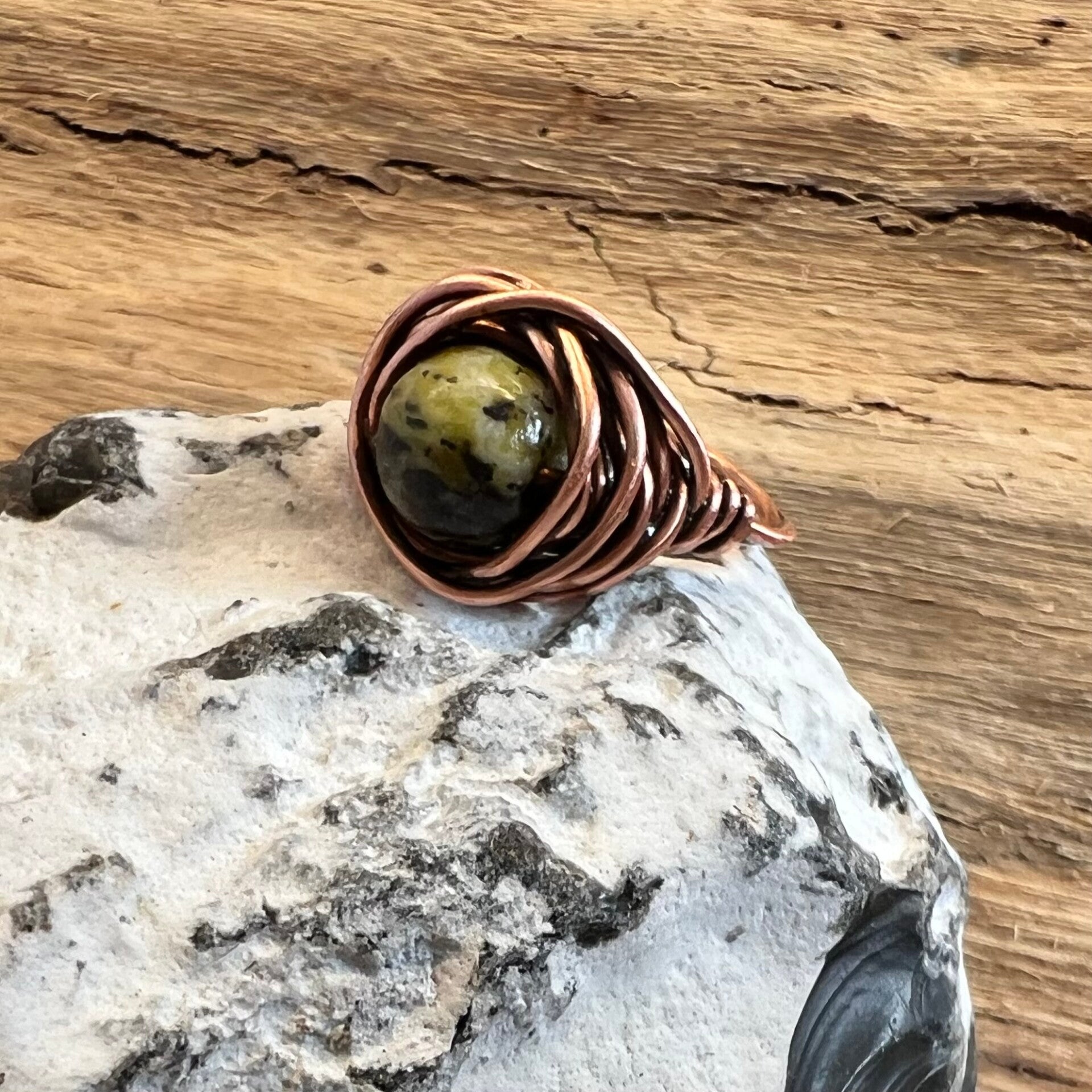 Ringen er håndlavet og kunstfærdigt viklet med vintage kobber, som fremhæver det organiske udtryk og tilfører et strejf af rå romantik. De fine detaljer i viklingen samler sig omkring stenen og skaber en form, der næsten minder om kronblade i bevægelse – en diskret hyldest til naturens former og styrke.