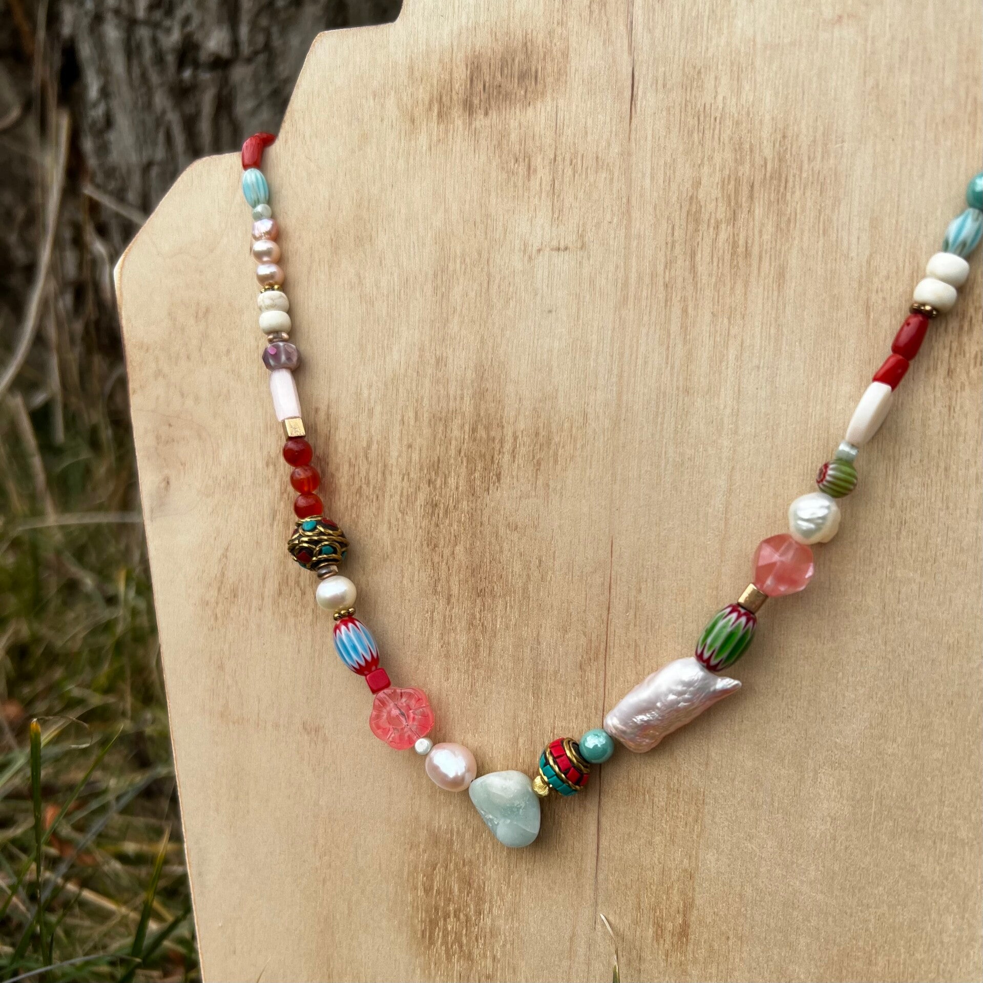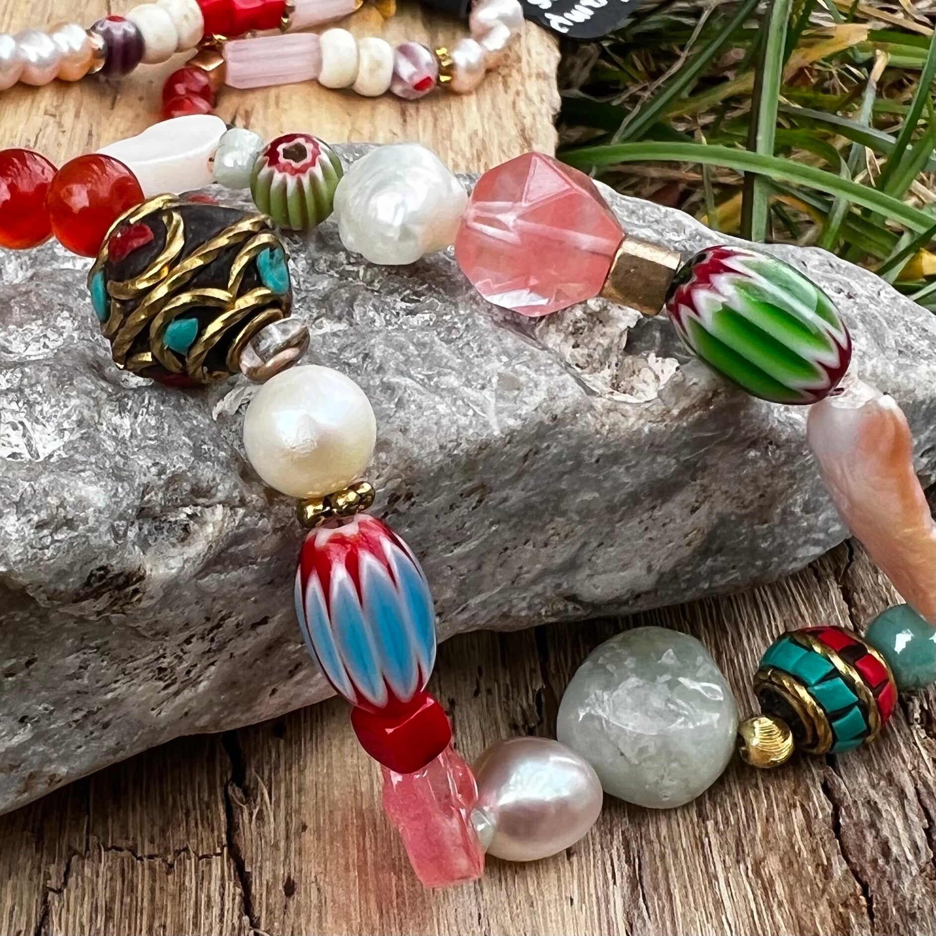 - Sten & Perler: Indisk Kashmir-perle (håndlavet med sten og metalmønster), Amazonite nuggets, rød koral, ferskvandsperler og shell.