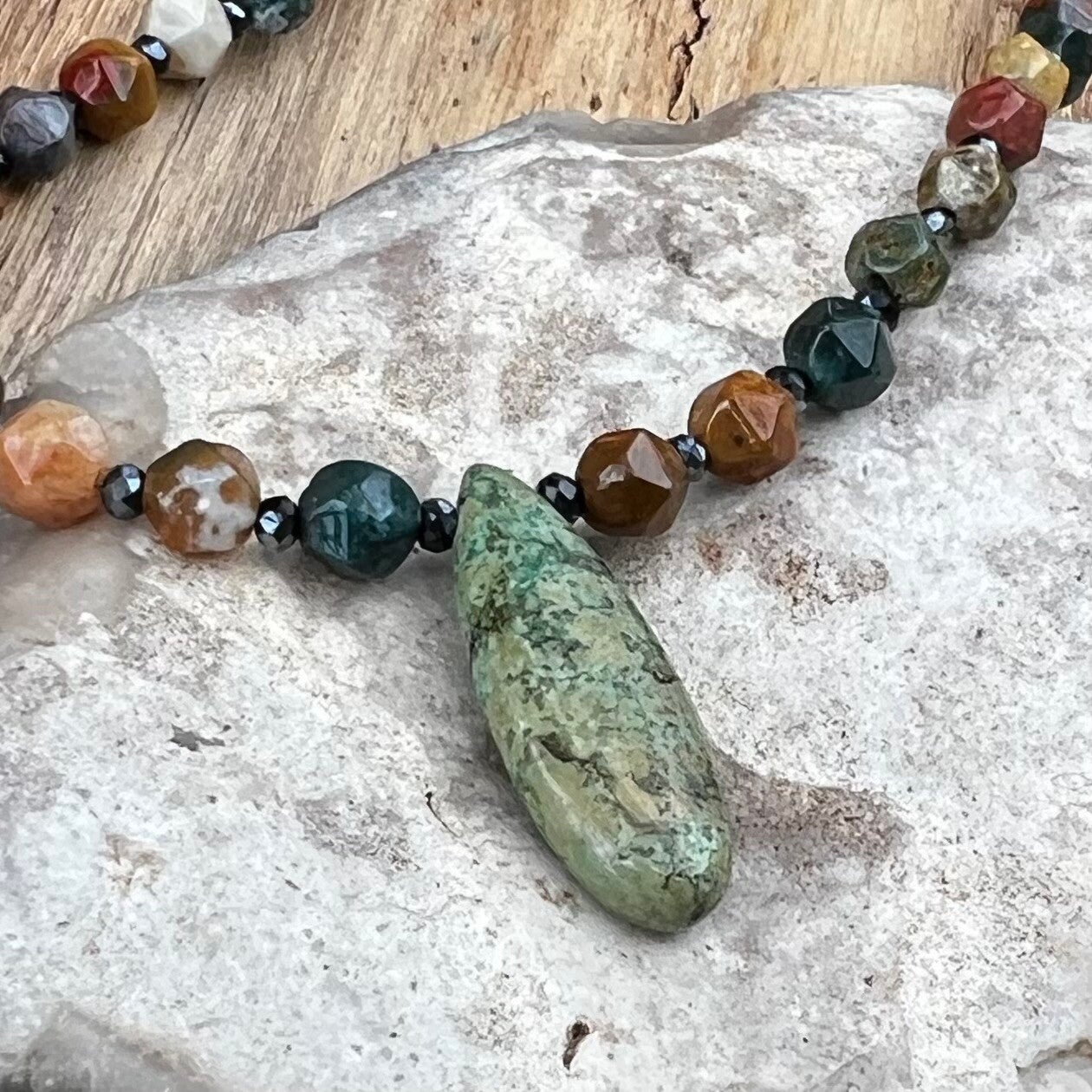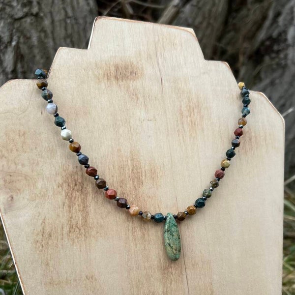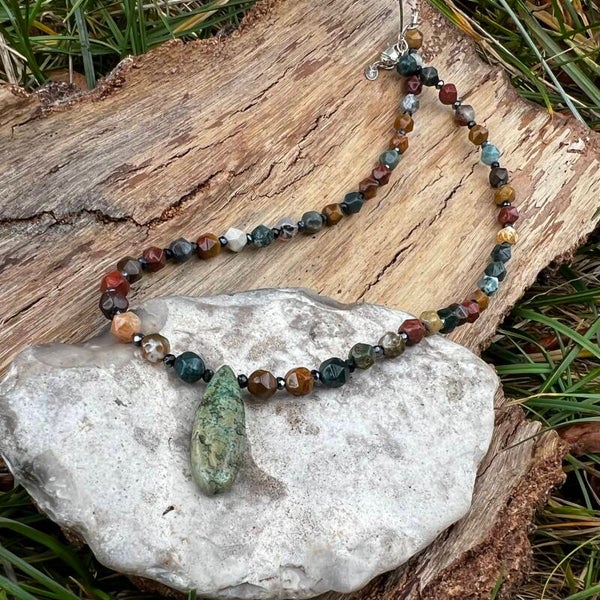 Halskædens naturlige midtpunkt er en smuk, grøn dråbeformet Magnesit, der hænger som en dyrebar skat fundet i dybet. Kontrasten mellem de mørke natursten og den lysende grønne dråbe gør dette smykke til et både kraftfuldt og elegant statement, der hylder naturens organiske skønhed.