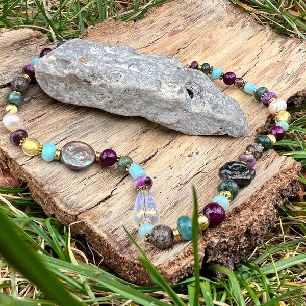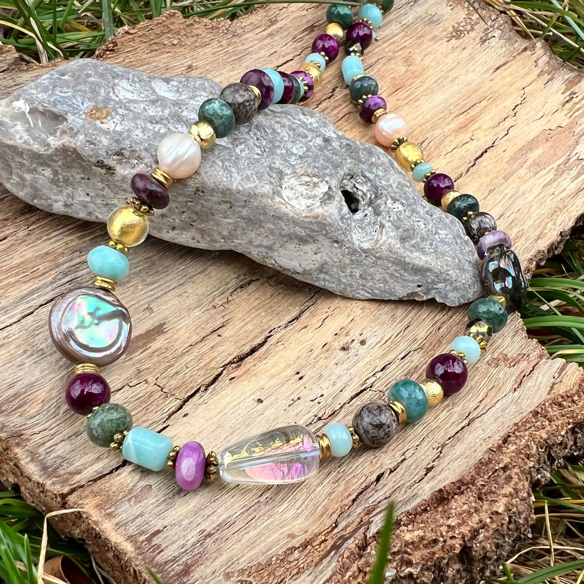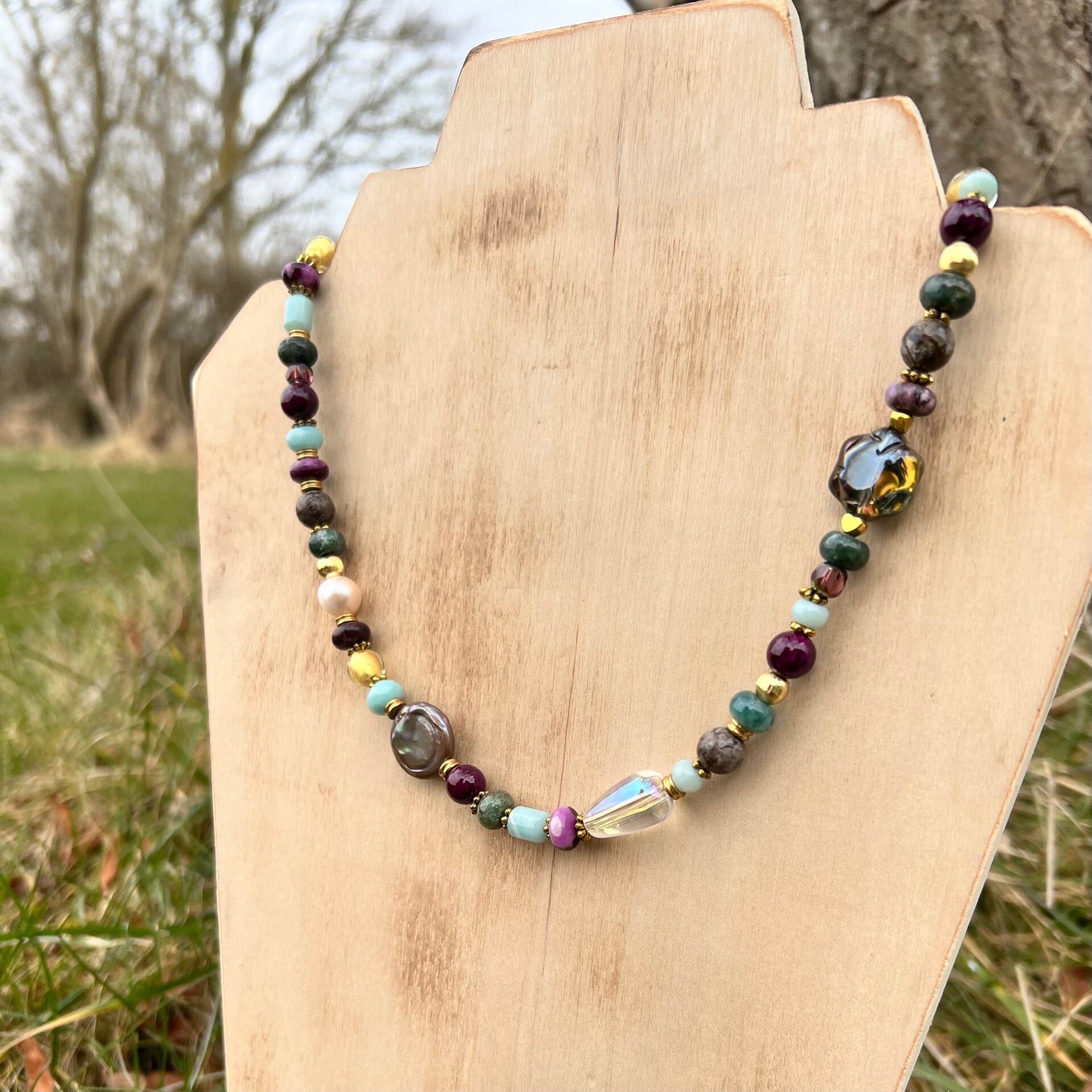 - Sten & Perler: Violet Lepidolit, turkis Amazonit, jordbrun Agat, ferskvandsperler, Lampwork og glas-detaljer.