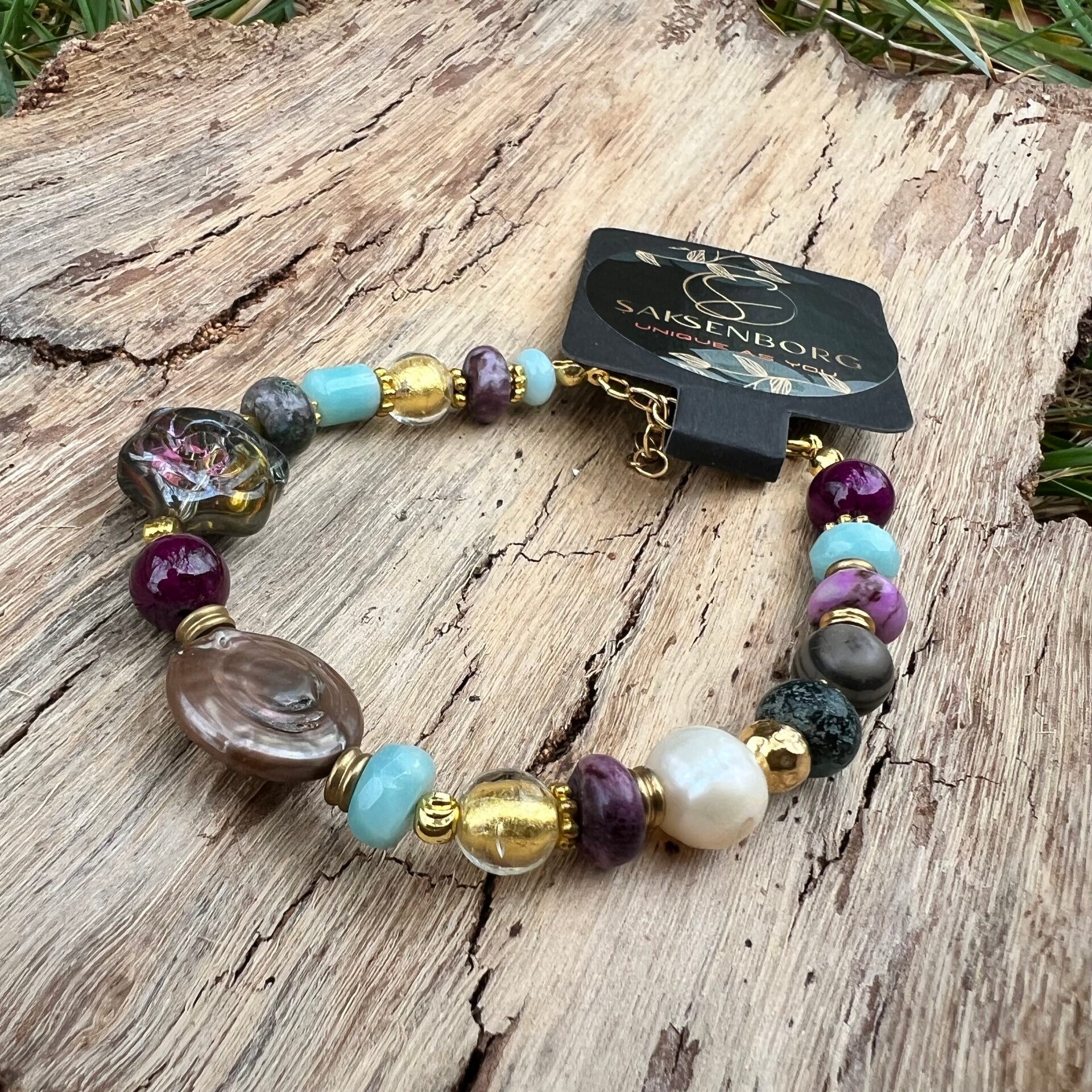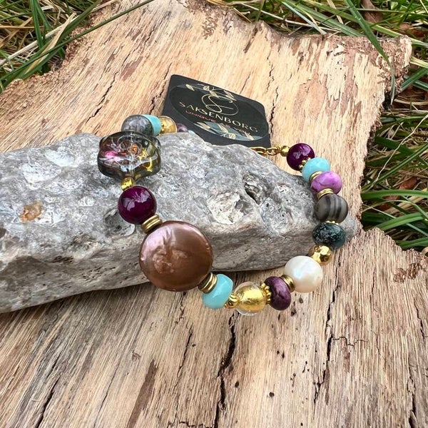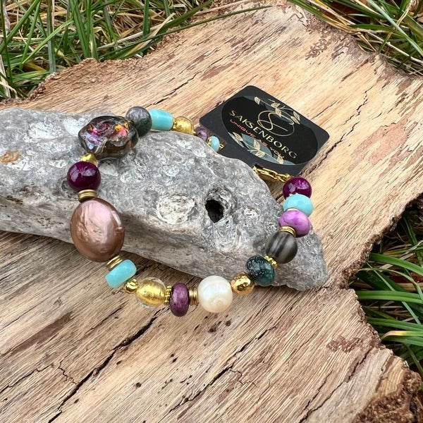 Dette unikke armbånd fuldender dit sæt med de samme luksuriøse materialer som halskæden. De mange forskellige former og størrelser på stenene skaber et organisk og legesygt udtryk omkring håndleddet, hvor de turkise og violette nuancer spiller smukt sammen med de gyldne detaljer.