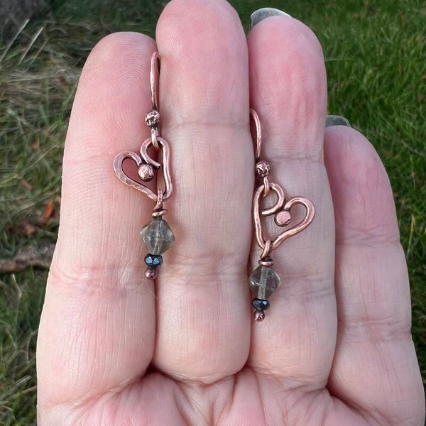 - Håndformede hjerter og håndlavede ørekroge i vintage kobber (oxideret og lakeret)