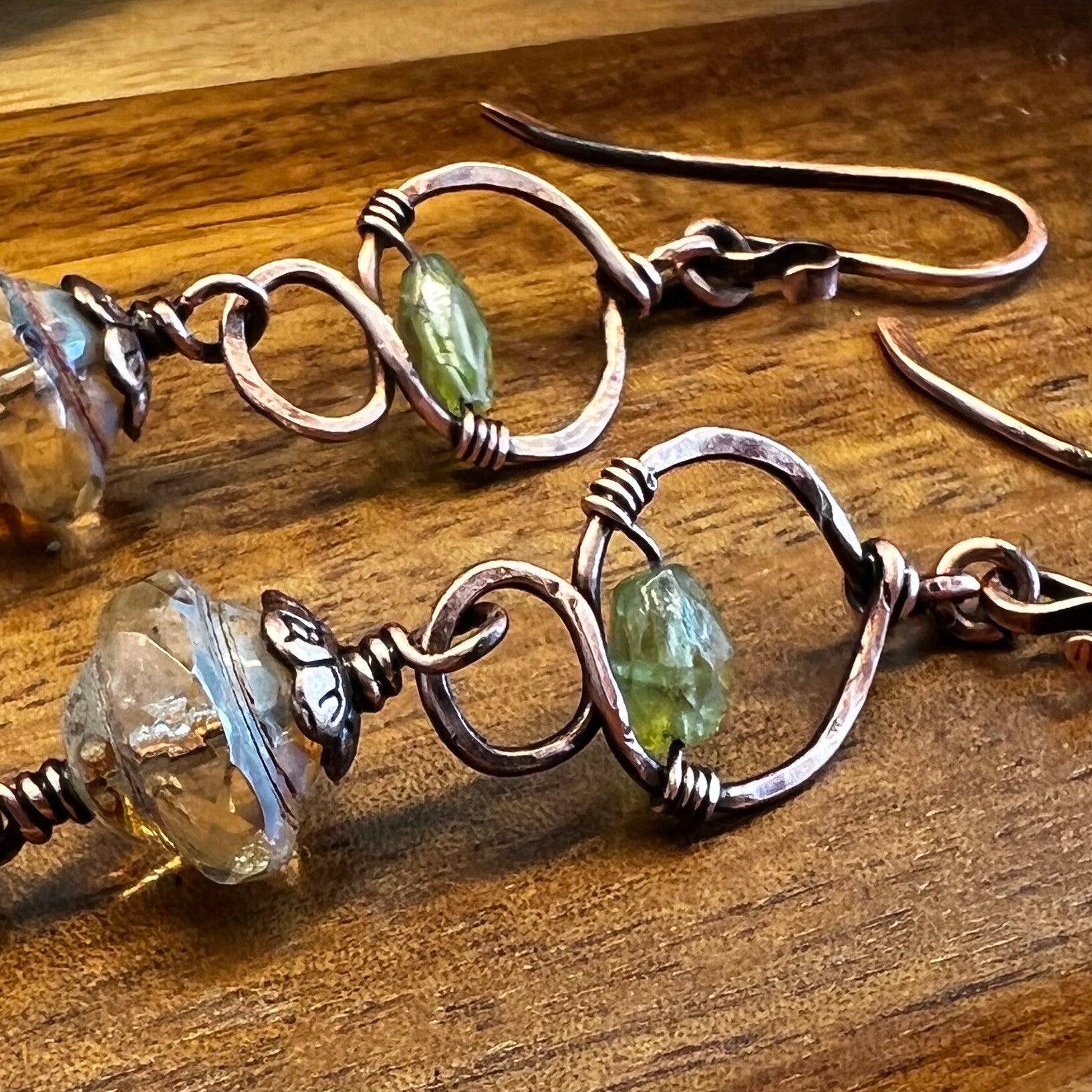 Designet er bygget op i to led af håndformede kobbercirkler, der giver smykket en antik karakter. Den øverste cirkel bærer en facetslebet Prehnit, mens den nederste rummer en Picasso Czech Glass-perle. Den håndlavede, flade kobberstang forneden giver tyngde og fuldender det vertikale statement-look.