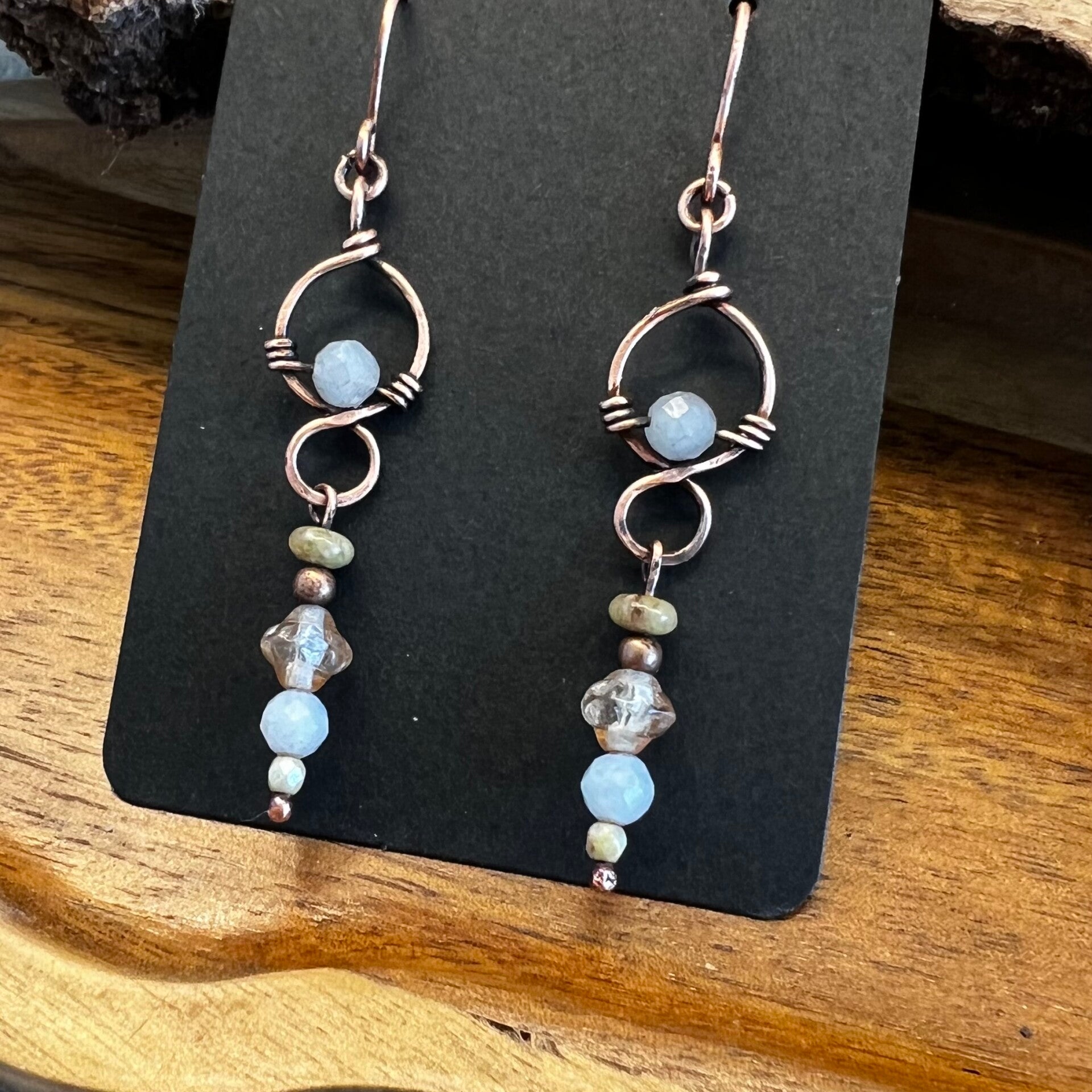 Disse unika-øreringe fra Ocean Whispers-serien bærer en let og drømmende energi. Med en længde på 6 cm kombinerer de det rå, bankede kobber med den klare, lyseblå Aquamarin og jordnære nuancer fra Jaspis.