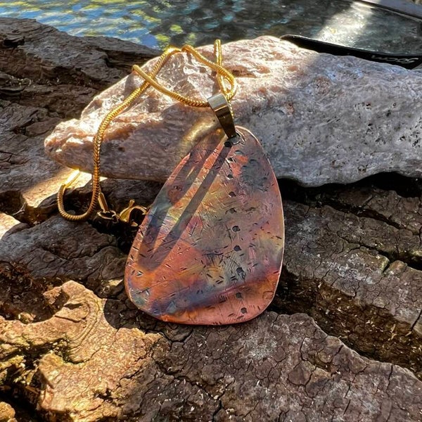 Vedhænget er en håndformet kobberplade (ca. 4 x 2,5 cm) med en organisk, let skæv dråbeform. Overfladen er præget med mønstre og farvet direkte med en flamme, hvilket skaber et fantastisk spil af nuancer, som aldrig kan kopieres ens. Det er et smykke til dig, der søger noget helt unikt, som balancerer det raffinerede og det rå.