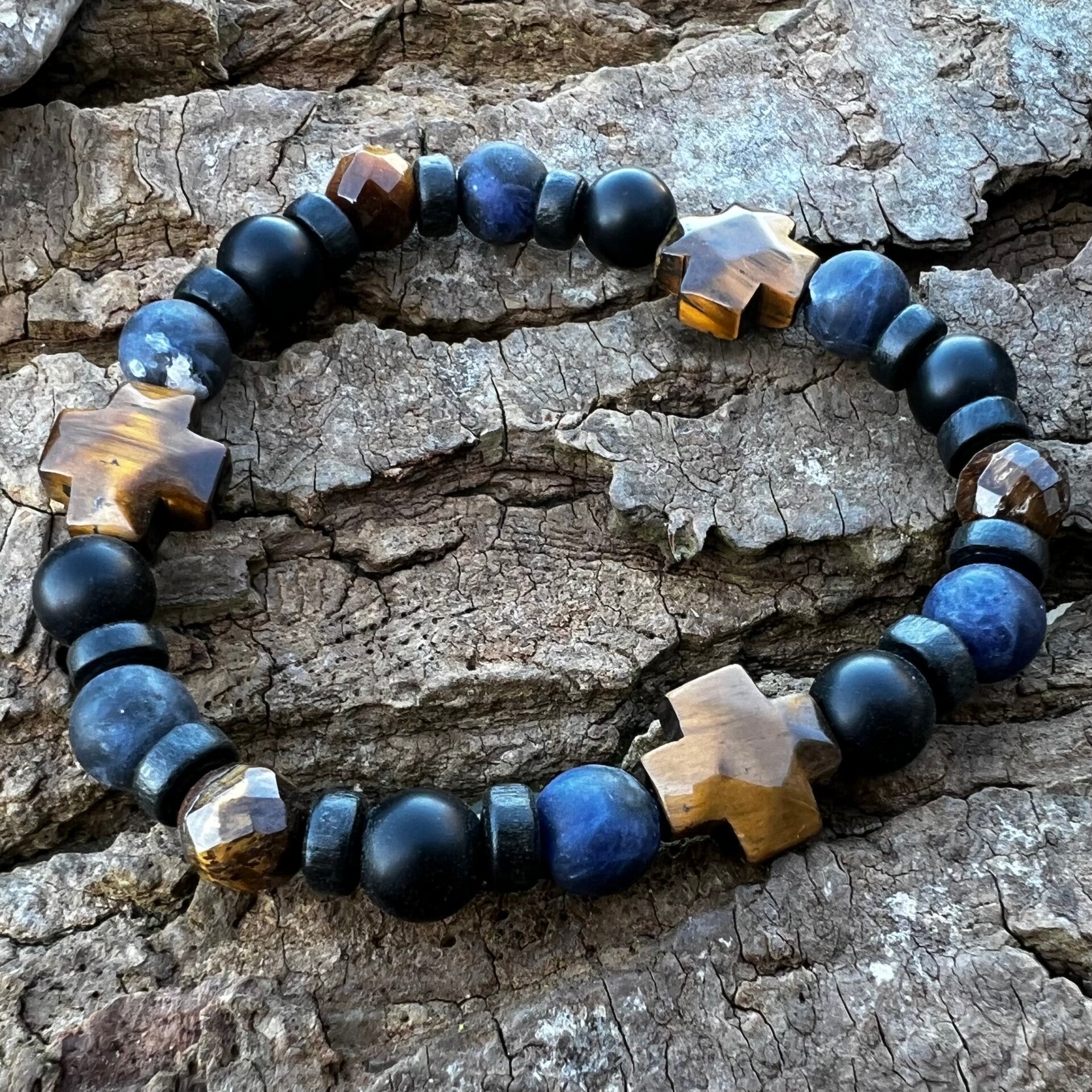 Designet er centreret omkring et ligebenet kors i Tigerøje. Blandingen af facetslebne sten, matte sorte overflader og de organiske kokosskiver gør, at armbåndet hele tiden ændrer karakter, alt efter hvordan lyset rammer det. Monteret på kraftig smykkeelastik for optimal pasform.